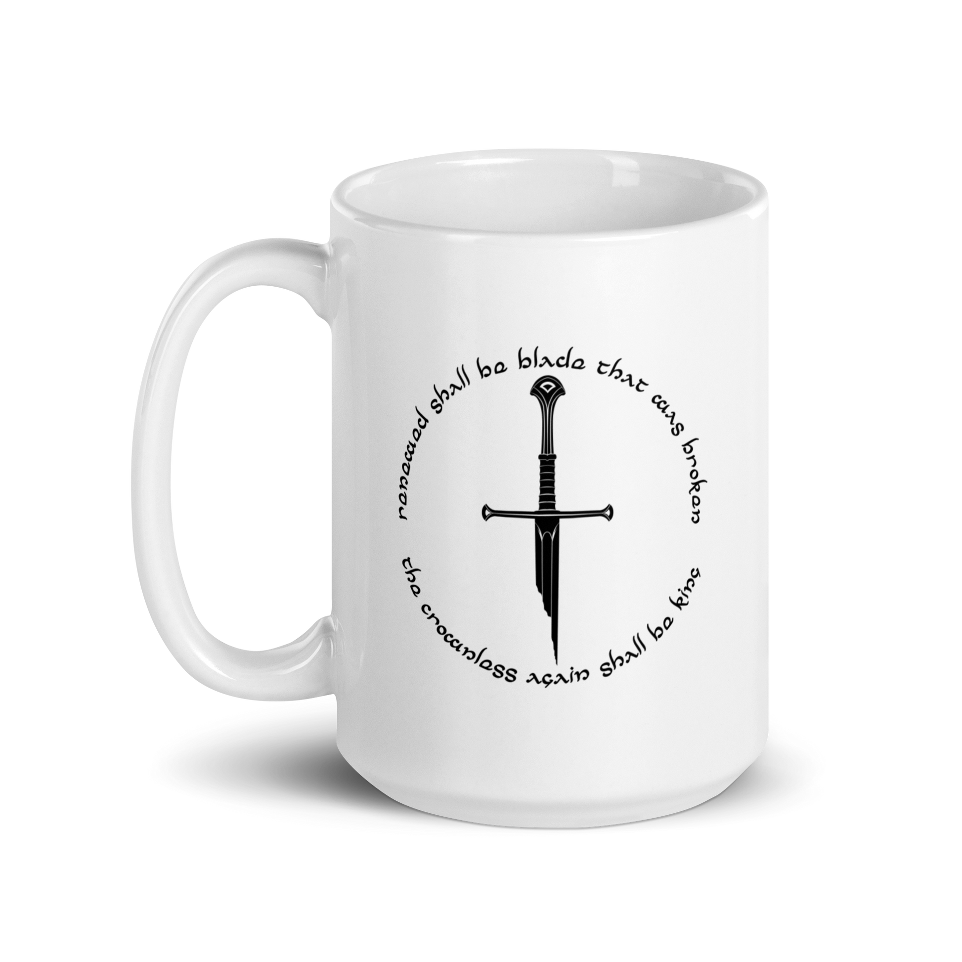 Sip from our "Narsil" Mug and honor the themes of renewal and destiny. The broken sword of Elendil, Narsil, graces the design, reminding us of the power of transformation. The round text "Remade shall be blade that was broken, the crownless again shall be king" weaves a tale of hope and triumph. With each sip, raise a toast to the enduring spirit of Middle-earth and the cycles of change that shape its destiny.