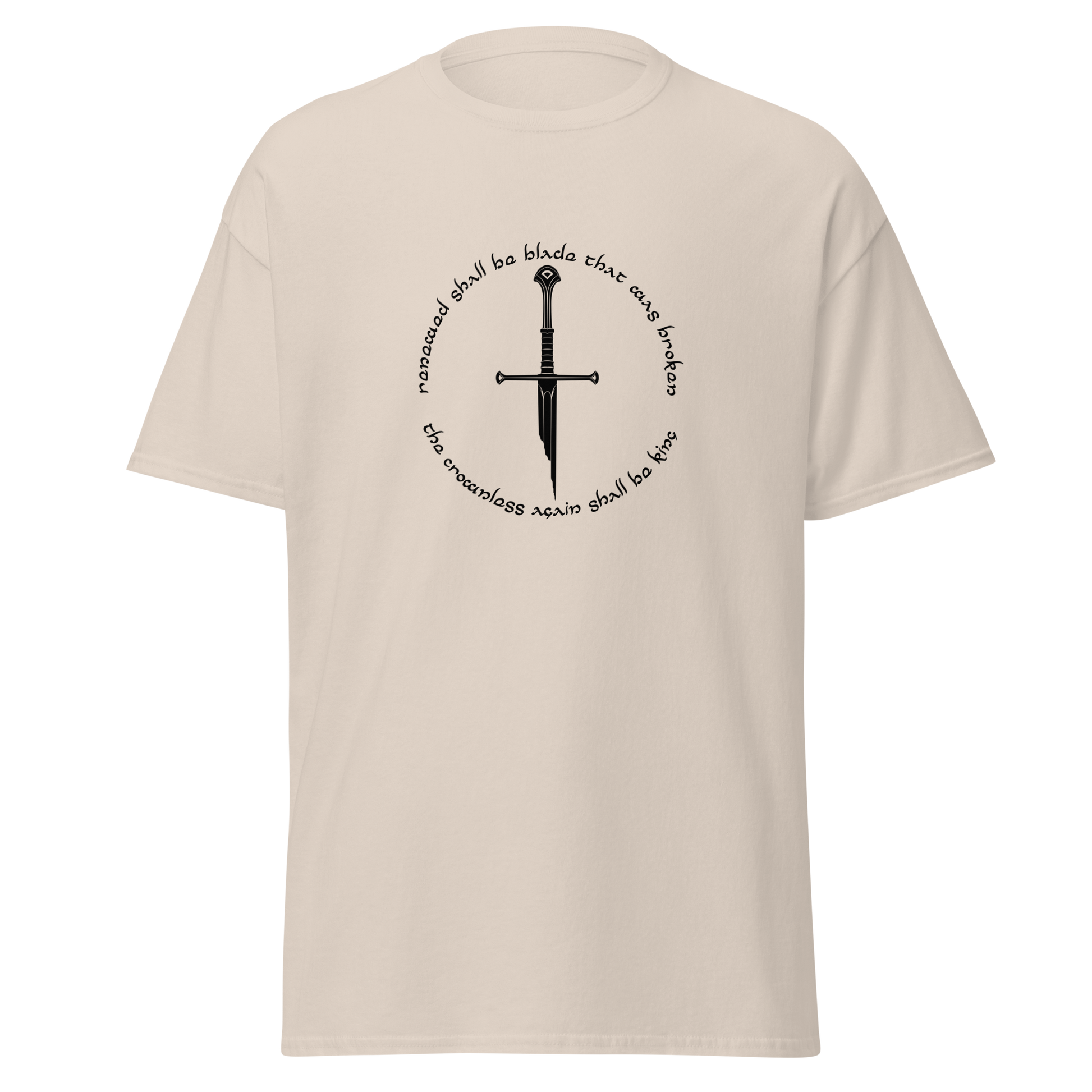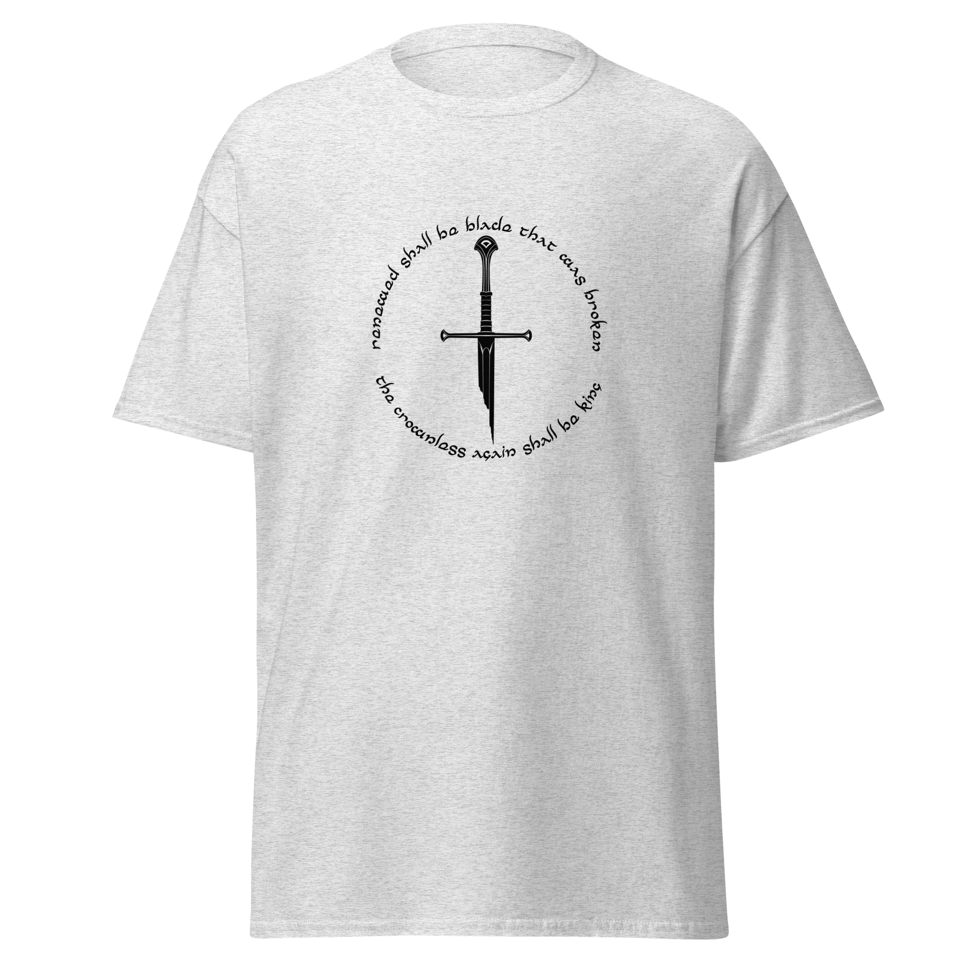 Wear the symbolism of rebirth proudly with our "Narsil" T-Shirt. The broken sword of Elendil, Narsil, takes center stage, embodying the theme of restoration and destiny. The round text "Remade shall be blade that was broken, the crownless again shall be king" weaves a tale of hope and renewal. Show your love for The Lord of the Rings and its timeless themes with this t-shirt, a tribute to the triumphant spirit of Middle-earth.