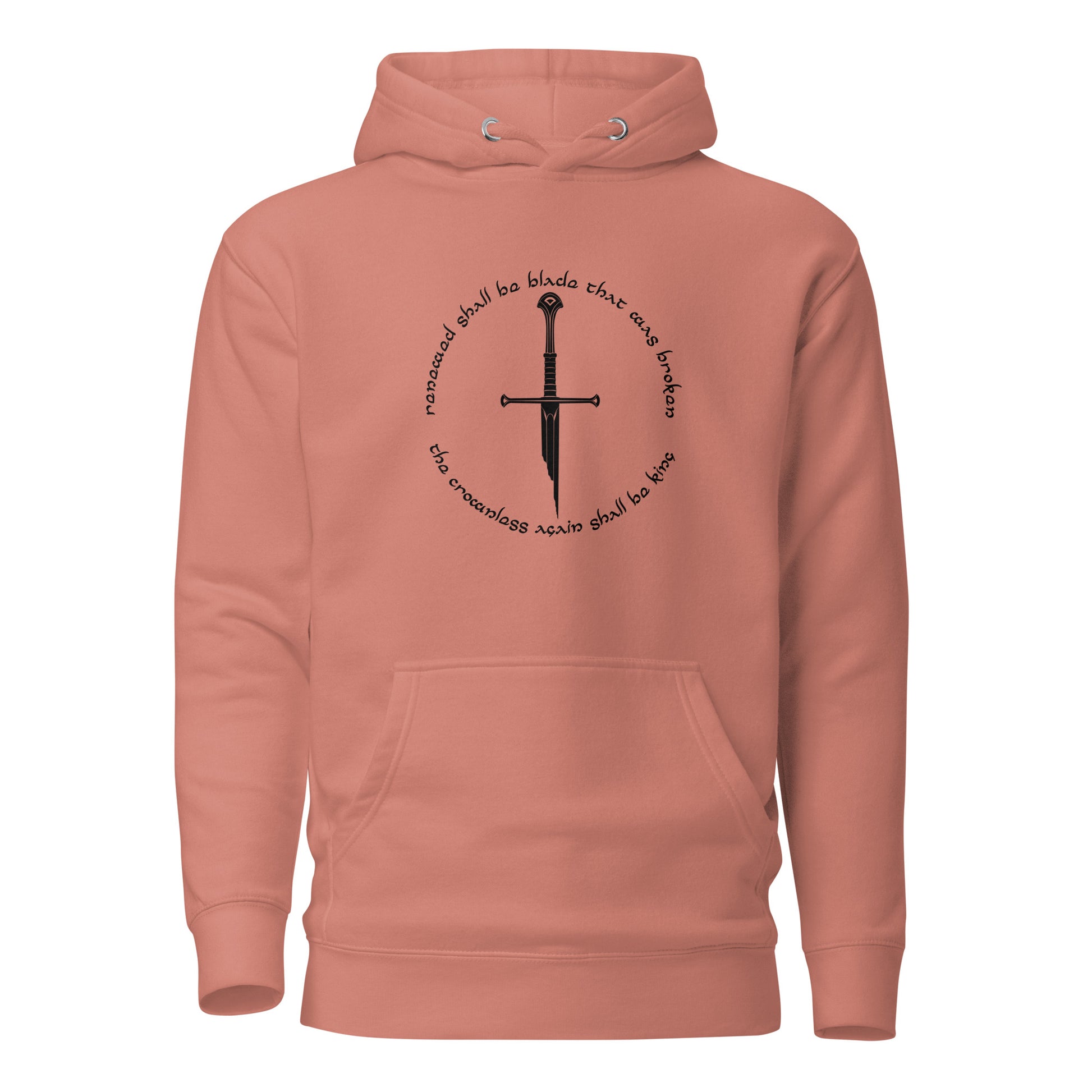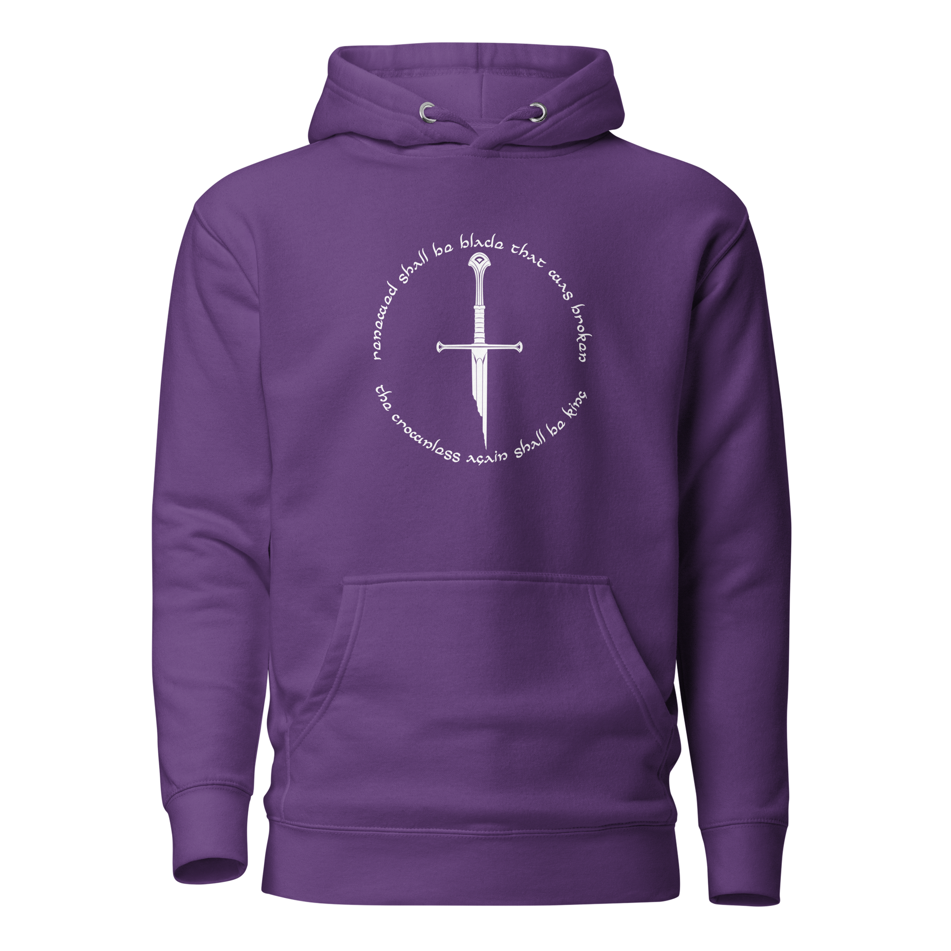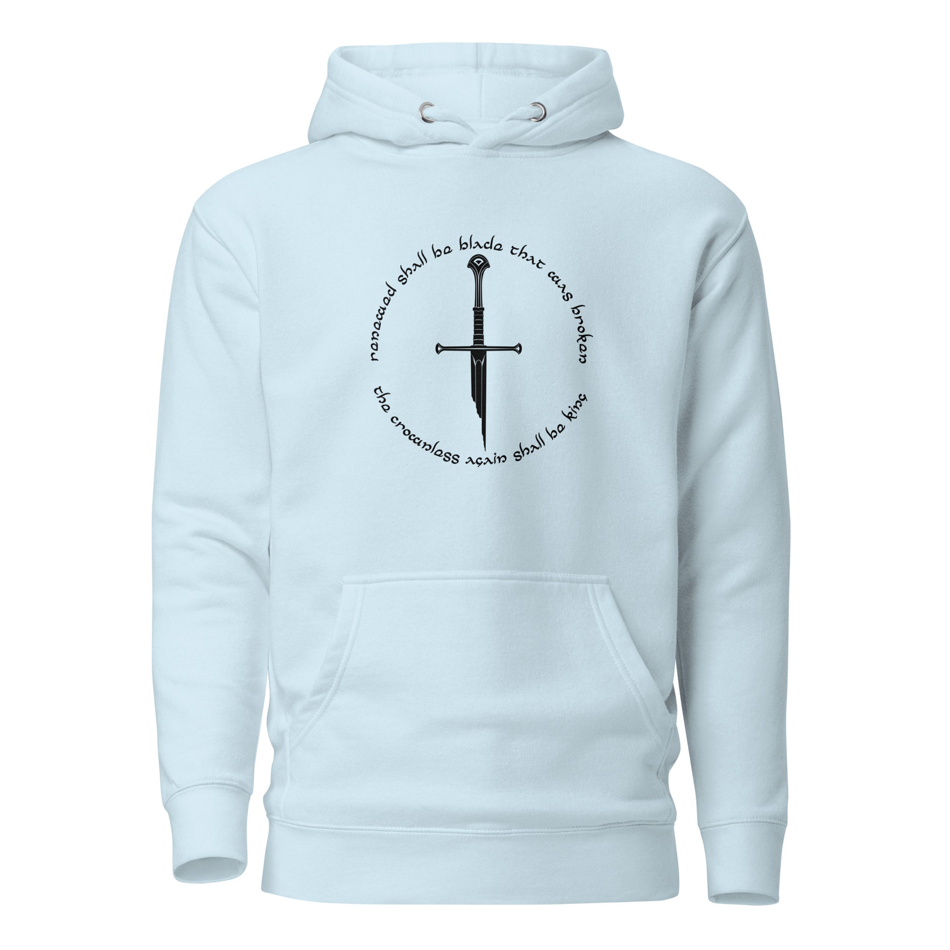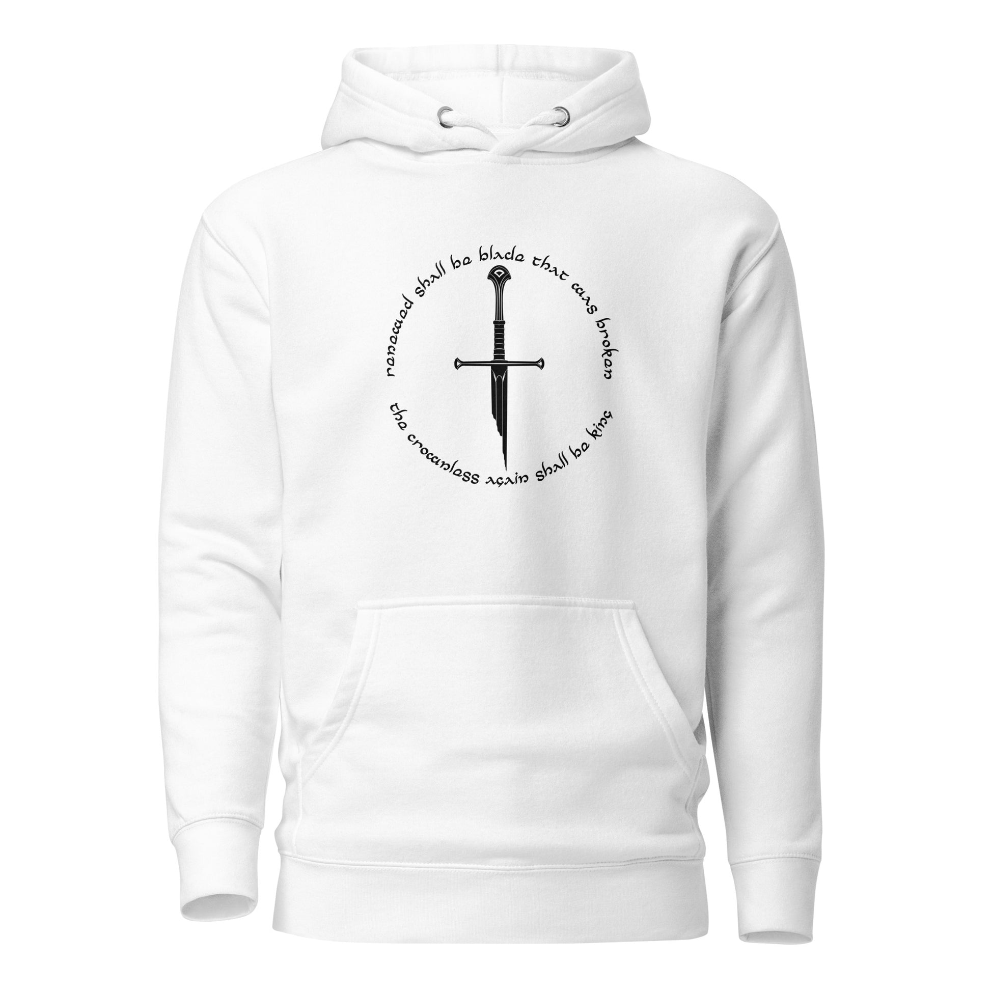 Embrace the spirit of renewal with our "Narsil" Hoodie. Featuring the iconic broken sword of Elendil, Narsil, this design captures the essence of resurrection and hope. The round text "Remade shall be blade that was broken, the crownless again shall be king" adds an air of destiny and determination. Stay warm and inspired by the legacy of the past and the promise of the future with this hoodie, a tribute to the enduring spirit of Middle-earth.