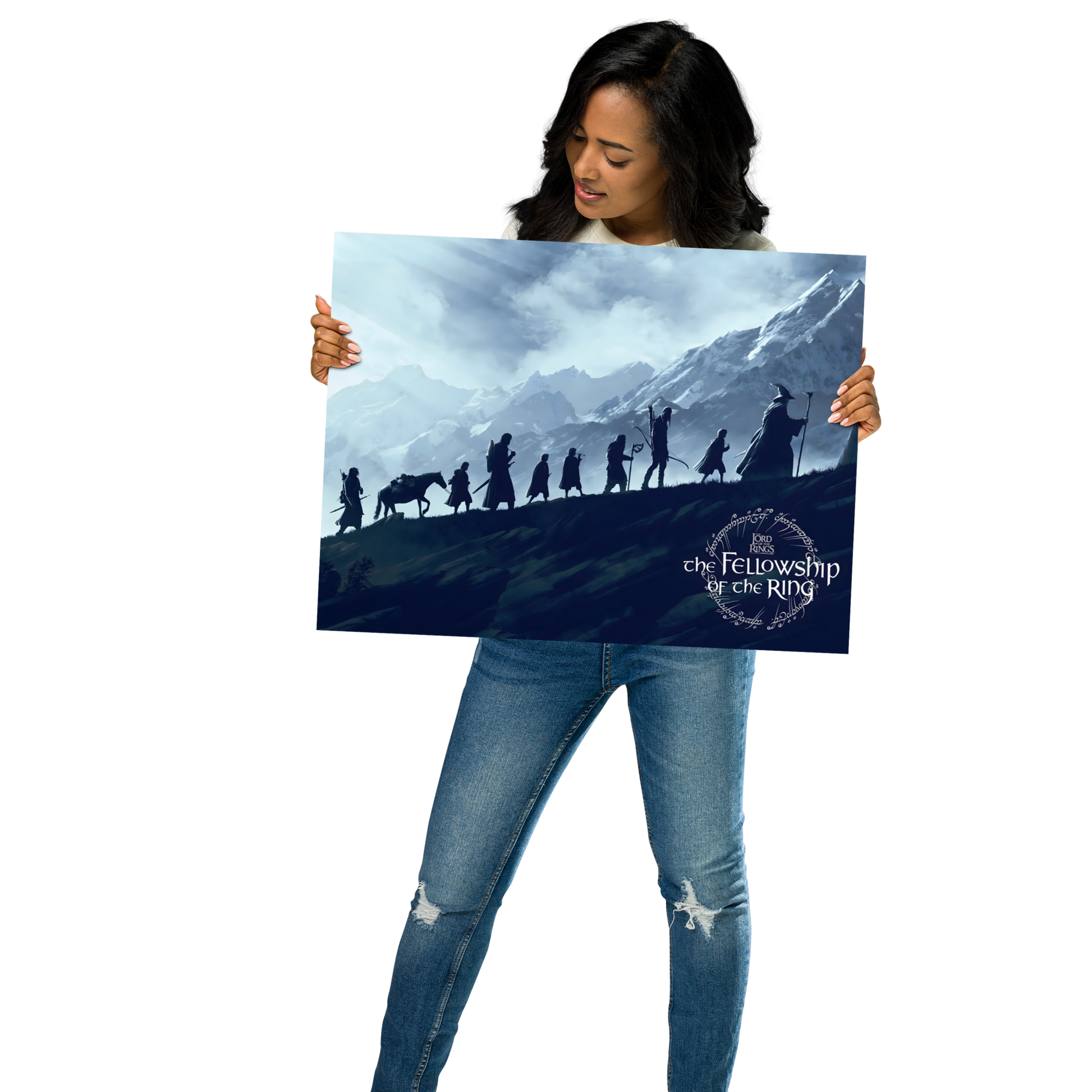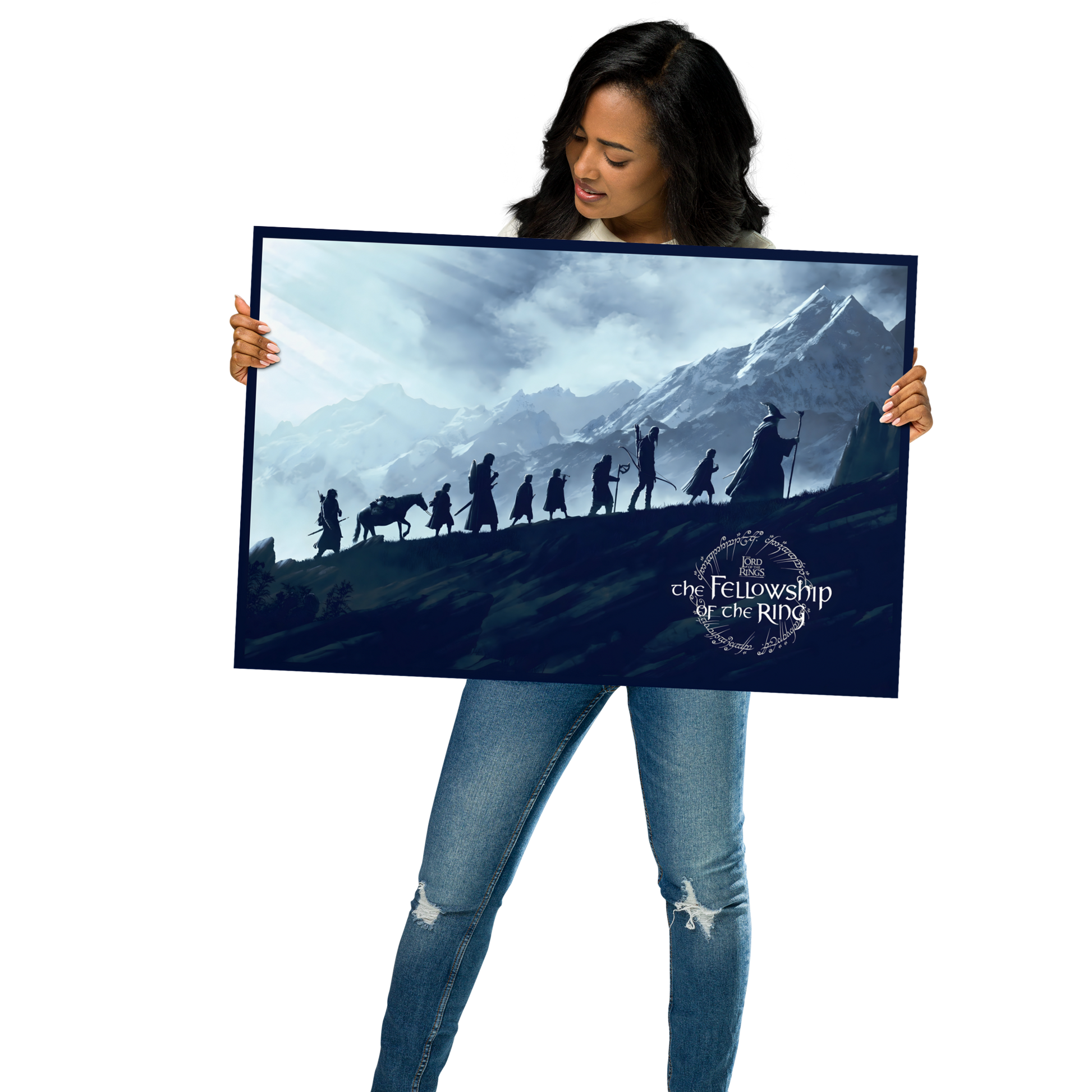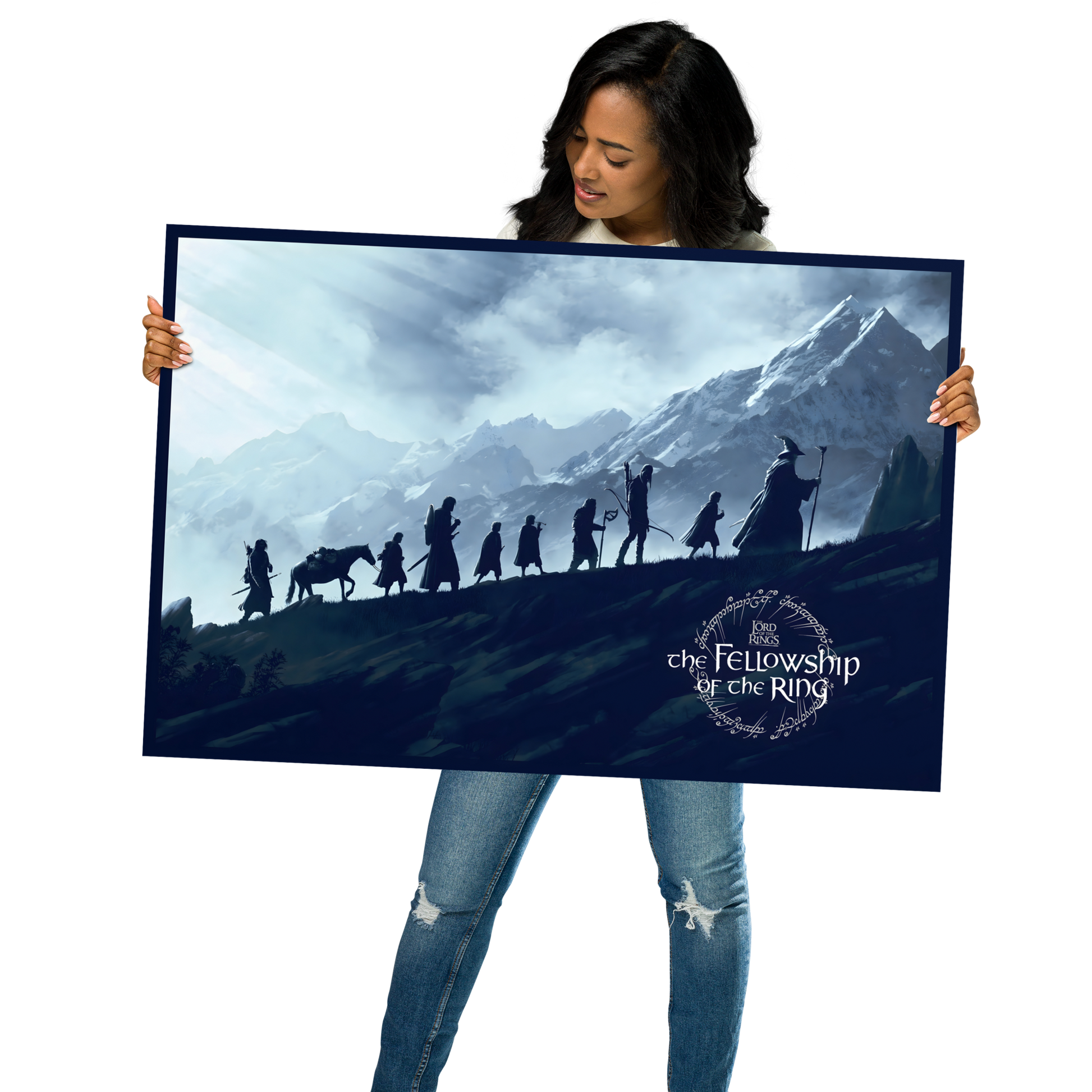 Relive the legendary quest of the Fellowship of the Ring with our poster. This captivating poster captures a defining moment in J.R.R. Tolkien's masterpiece, showcasing the silhouette of Frodo, Sam, Aragorn, and the entire Fellowship as they embark on their perilous journey through the enchanting landscapes of Middle-earth.