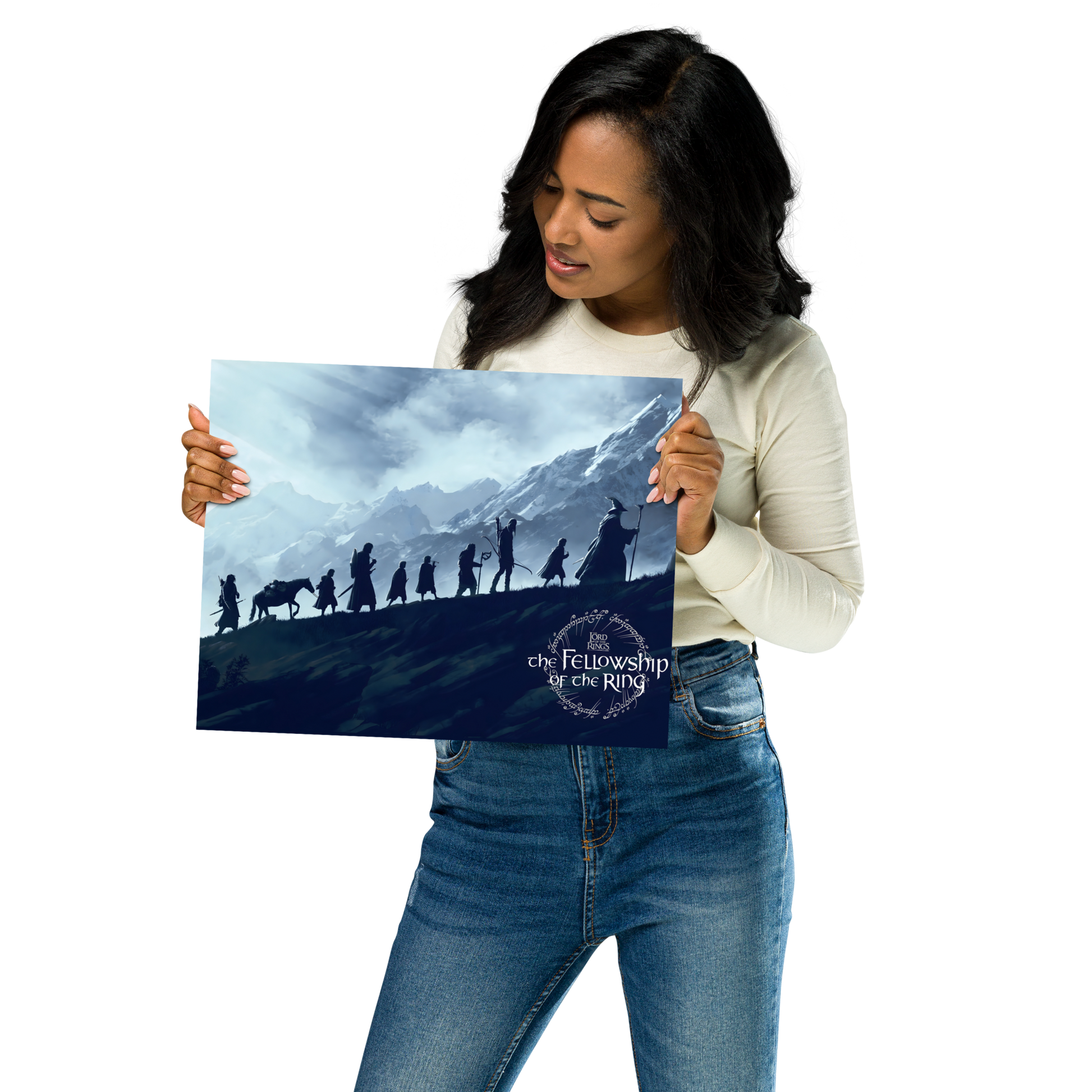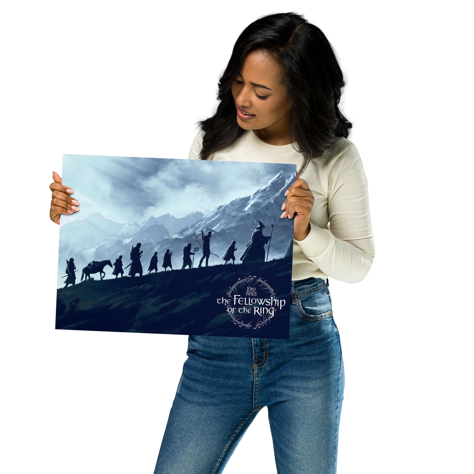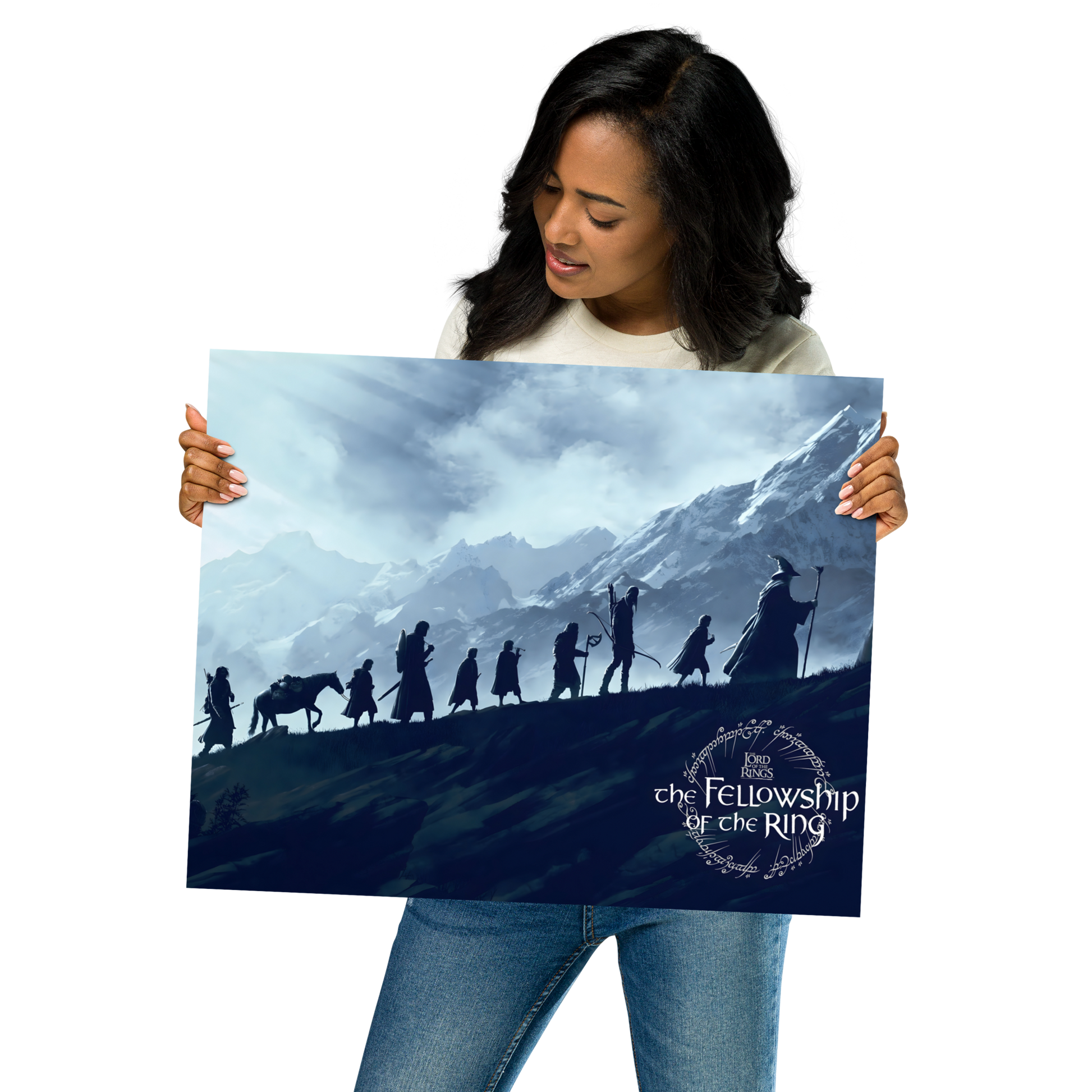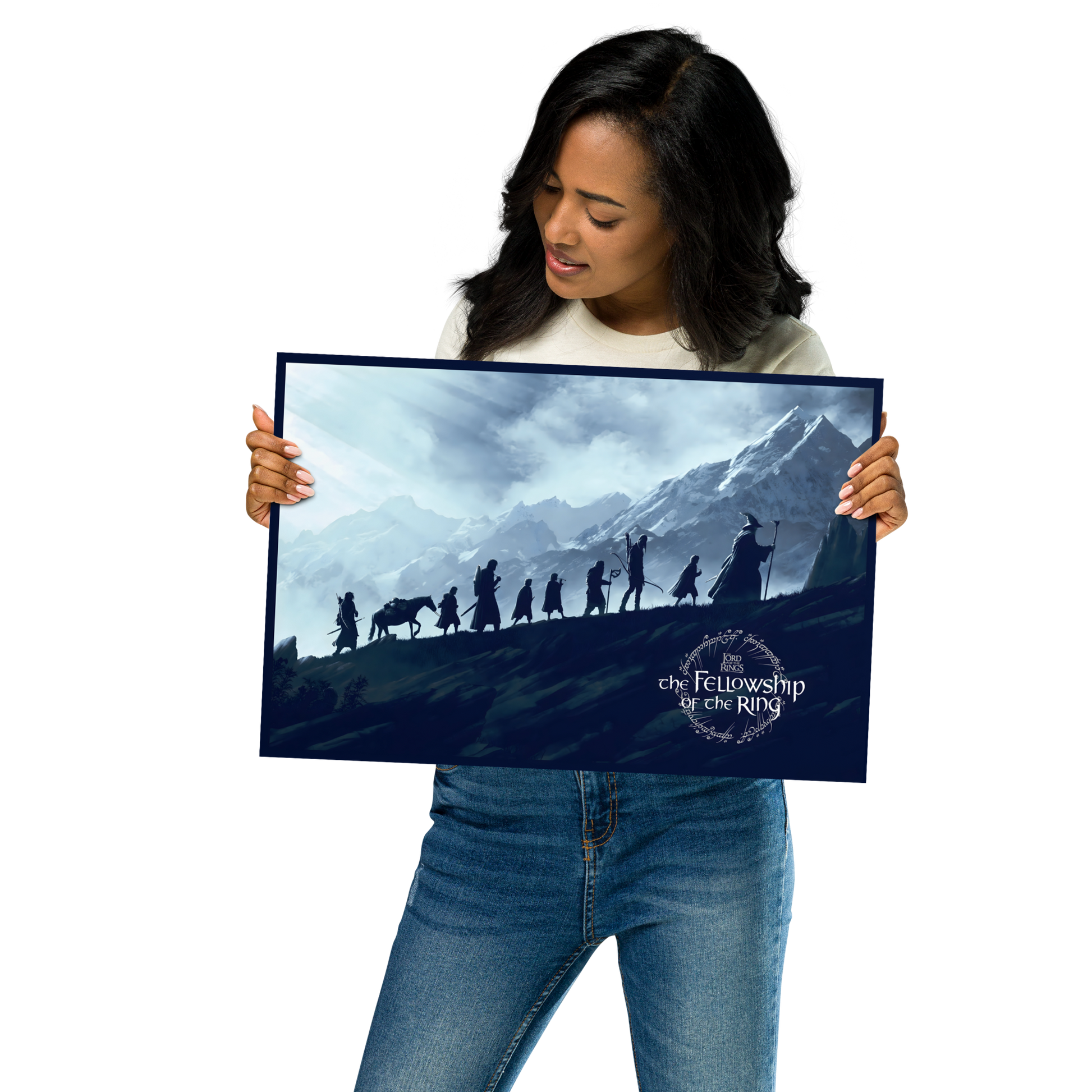 Relive the legendary quest of the Fellowship of the Ring with our poster. This captivating poster captures a defining moment in J.R.R. Tolkien's masterpiece, showcasing the silhouette of Frodo, Sam, Aragorn, and the entire Fellowship as they embark on their perilous journey through the enchanting landscapes of Middle-earth.