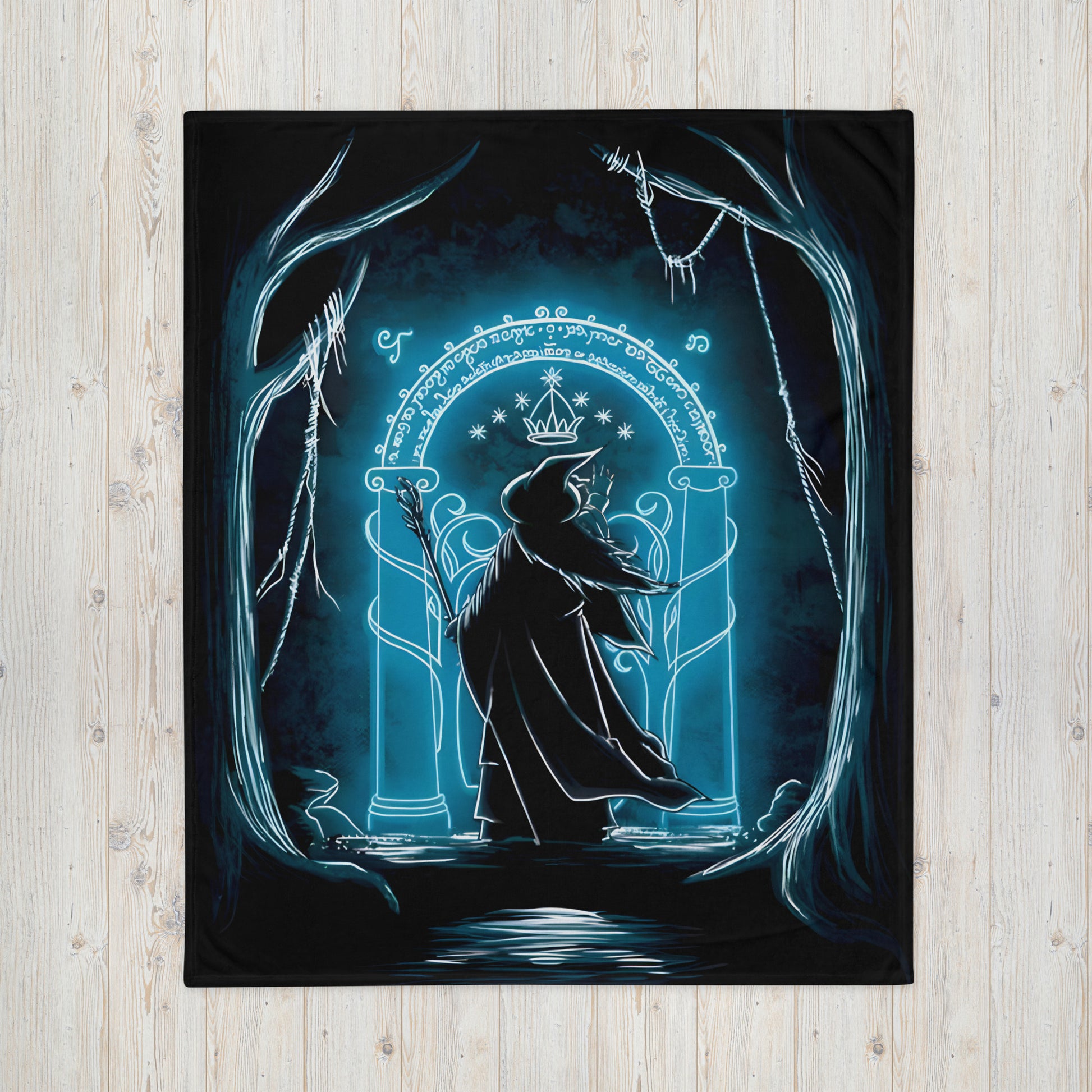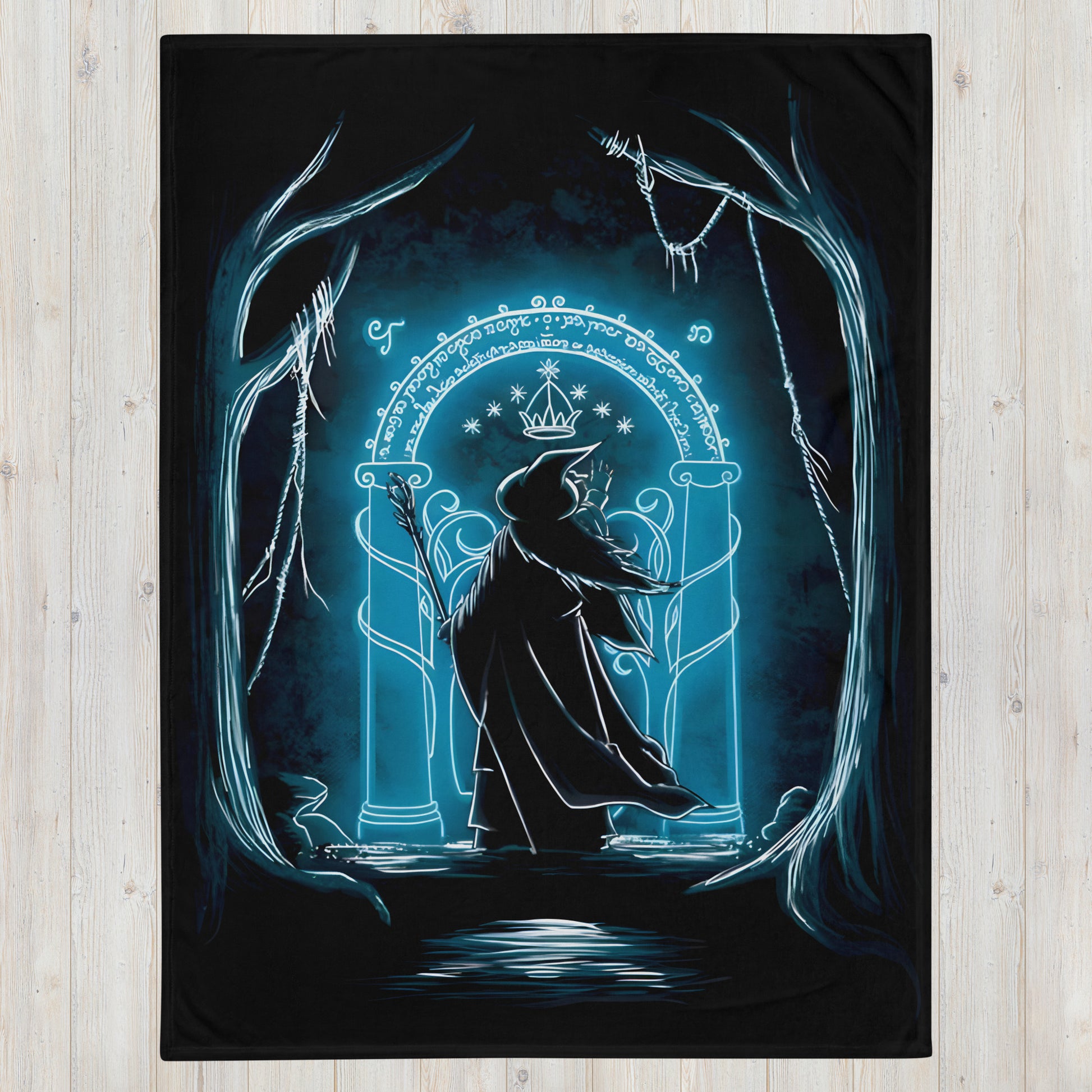 Embark on a journey through Middle-earth with our "Gates of Moria Throw Blanket." This enchanting throw isn't just a cozy companion; it's a visual ode to the iconic moment when Gandalf stood before the imposing Gates of Moria. The captivating print invites you to relive the magic of that legendary scene, making this throw blanket a cherished addition to the home of any Lord of the Rings enthusiast.