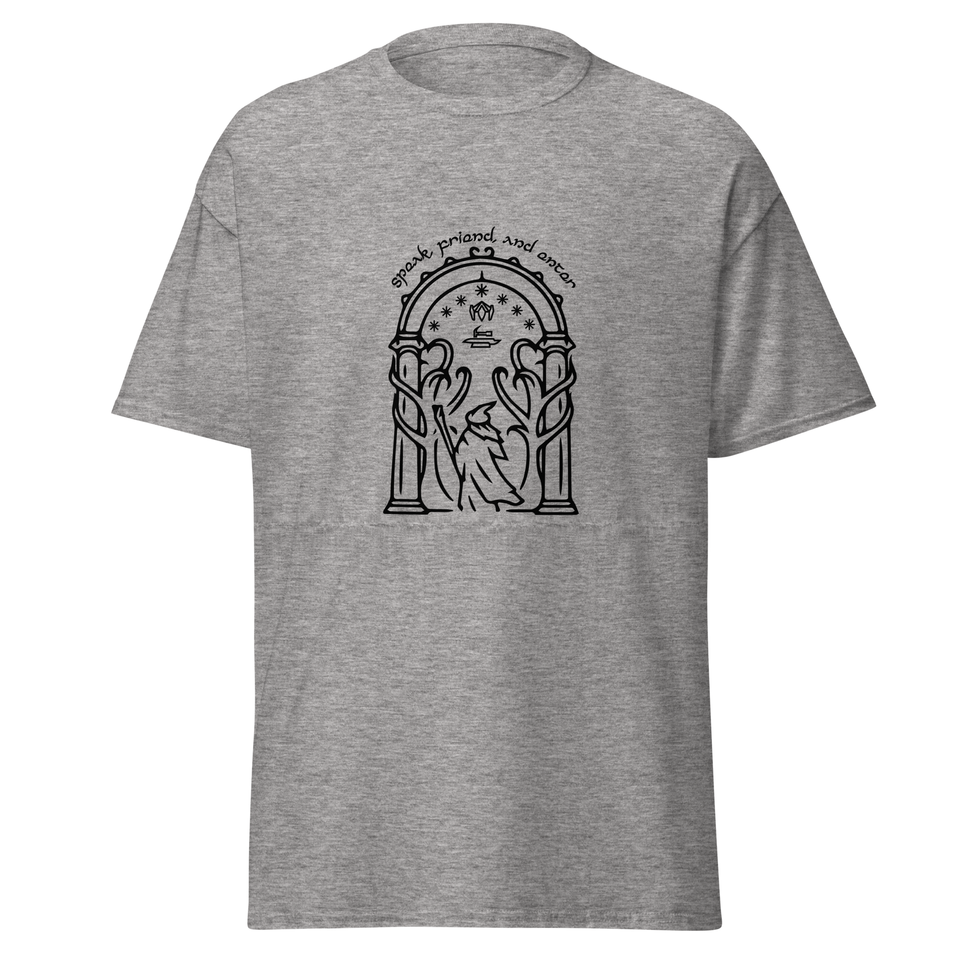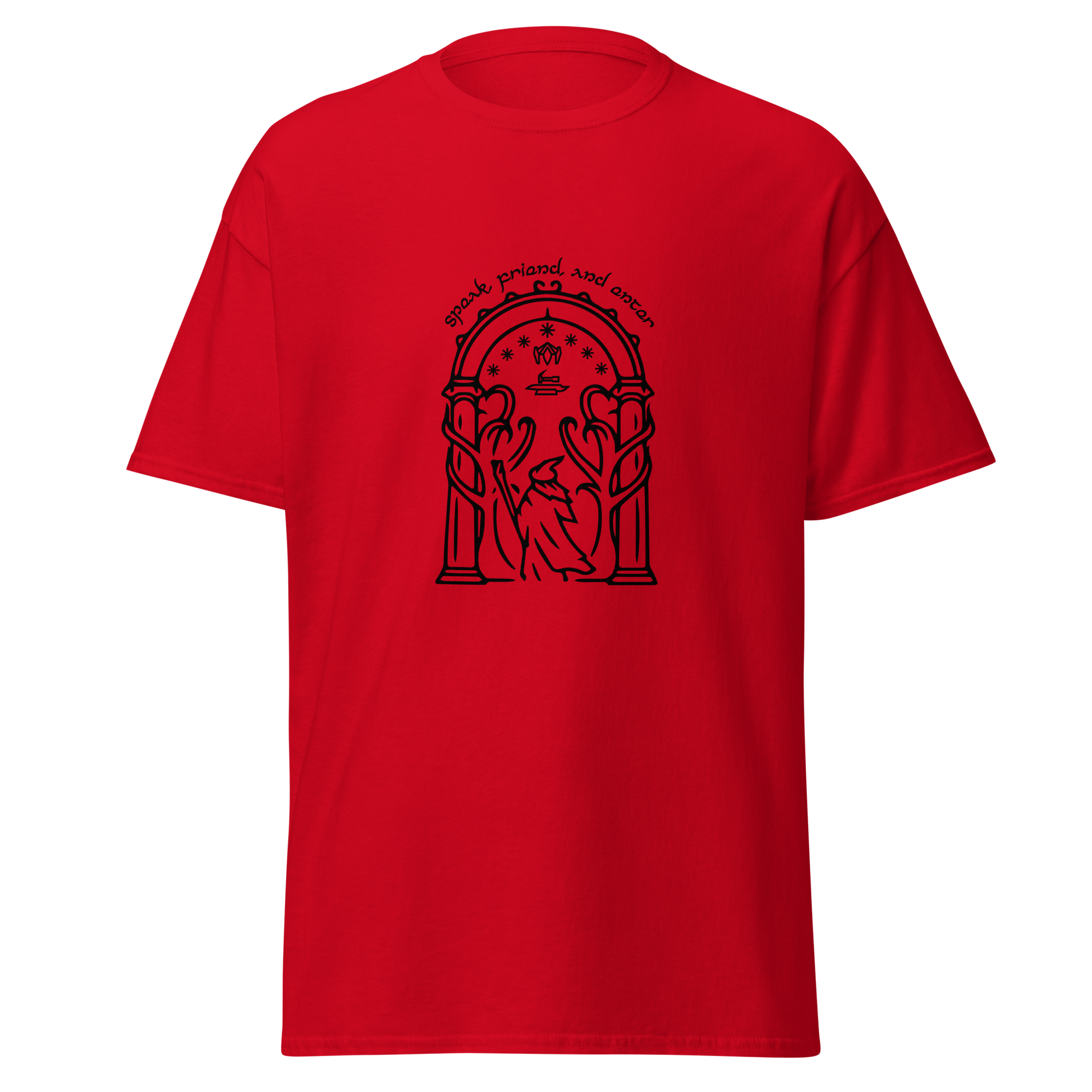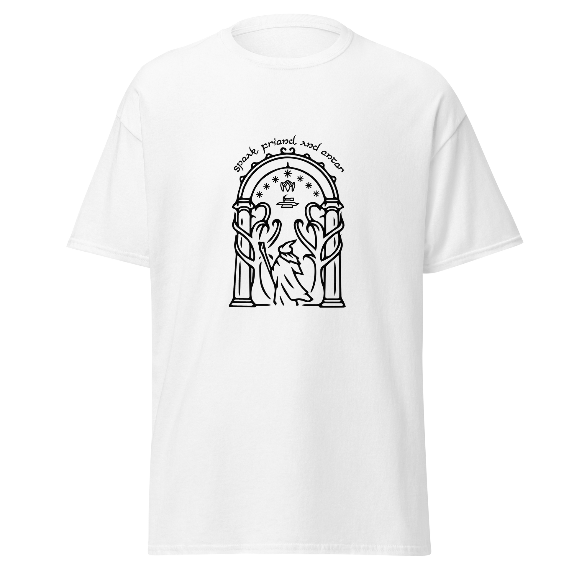 Discover the beauty of Durin's realm with our Doors of Durin T-Shirt. This captivating design captures the essence of the fabled doors. As a true fan of The Lord of the Rings, you can wear your passion proudly and make a statement wherever you go. Crafted for both style and comfort, our t-shirt is a must-have addition to your collection of fantasy-inspired apparel.