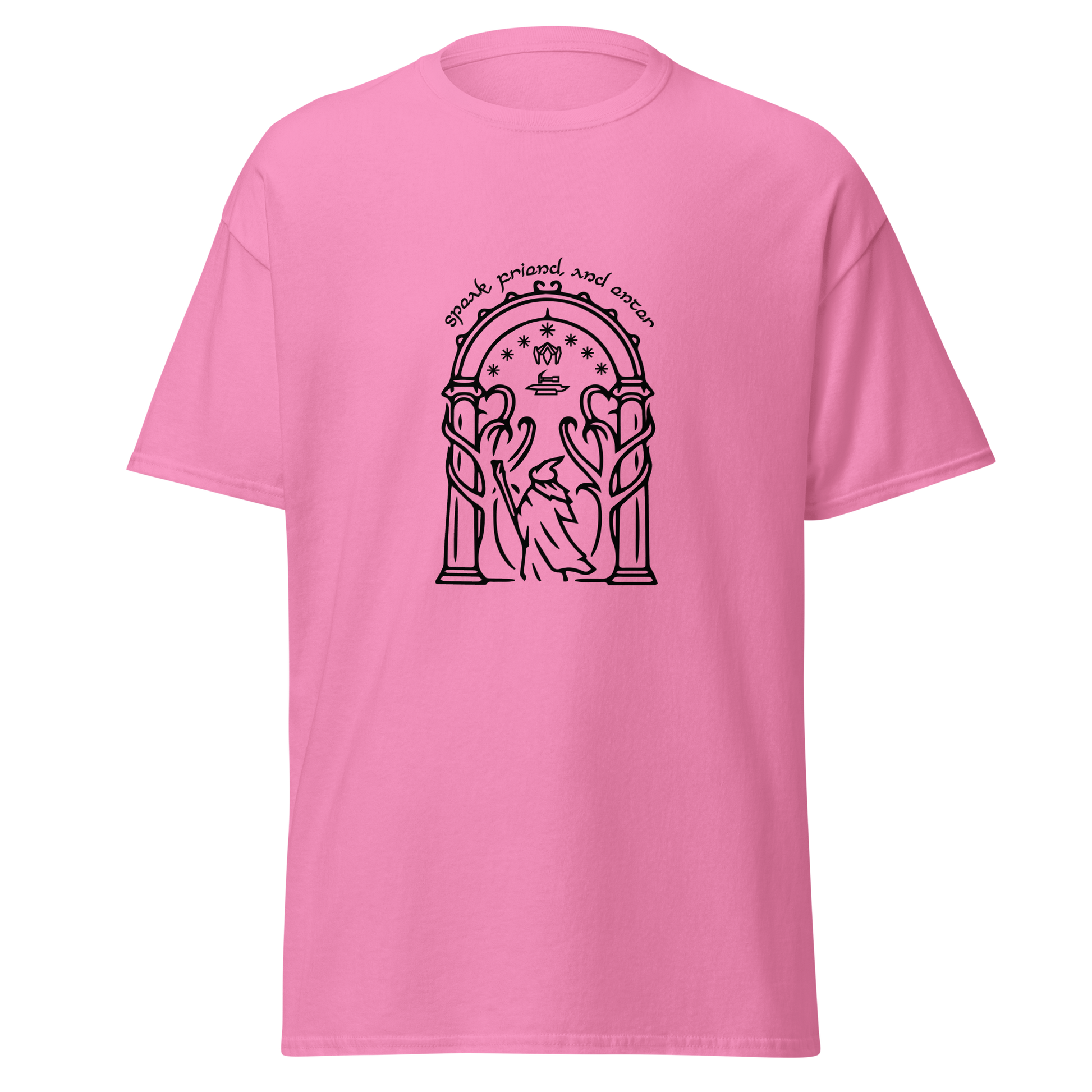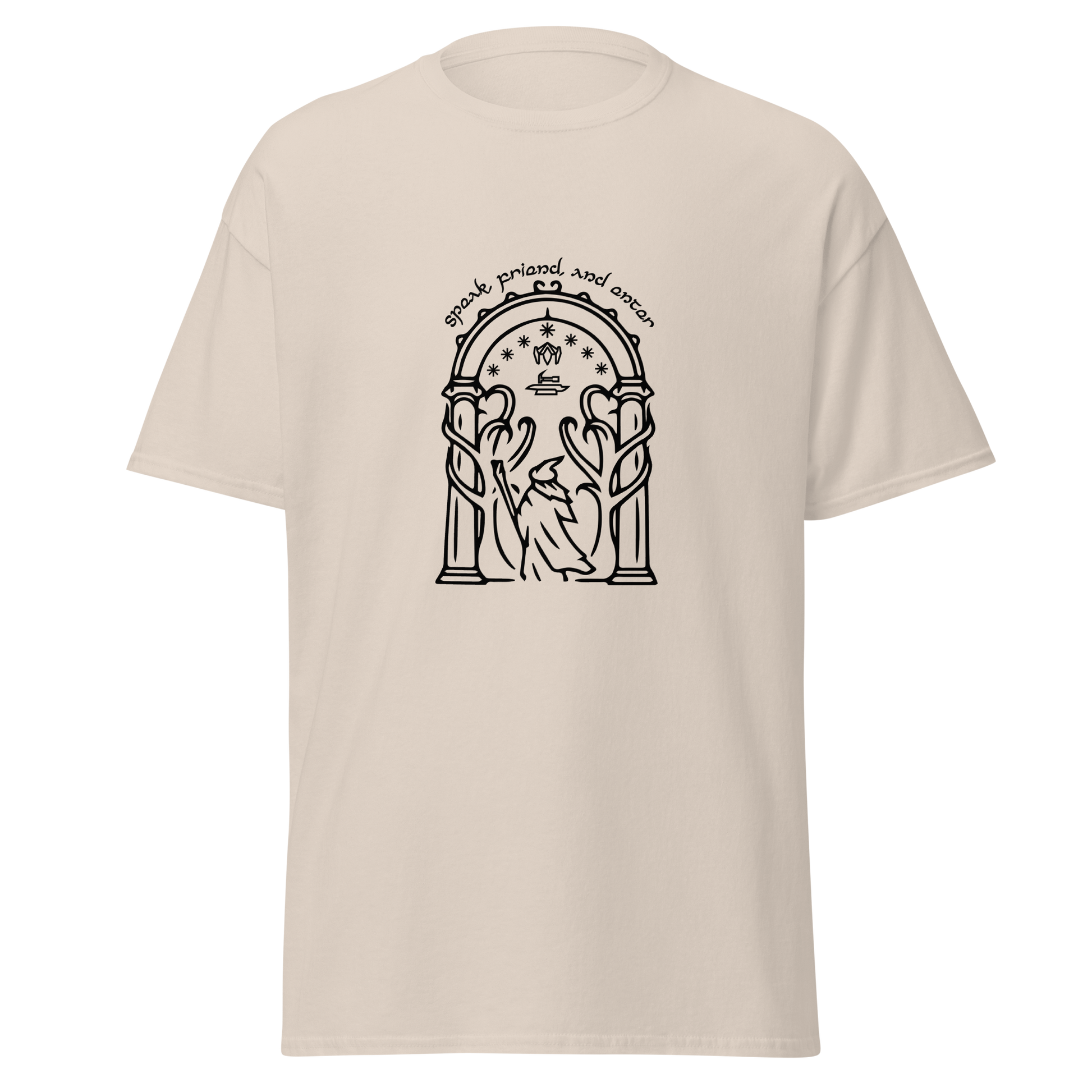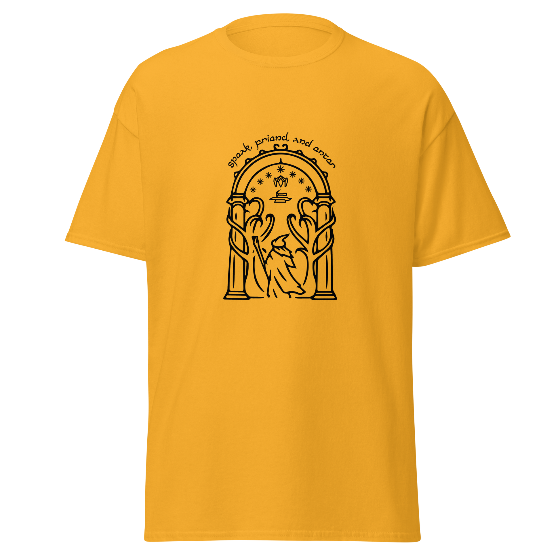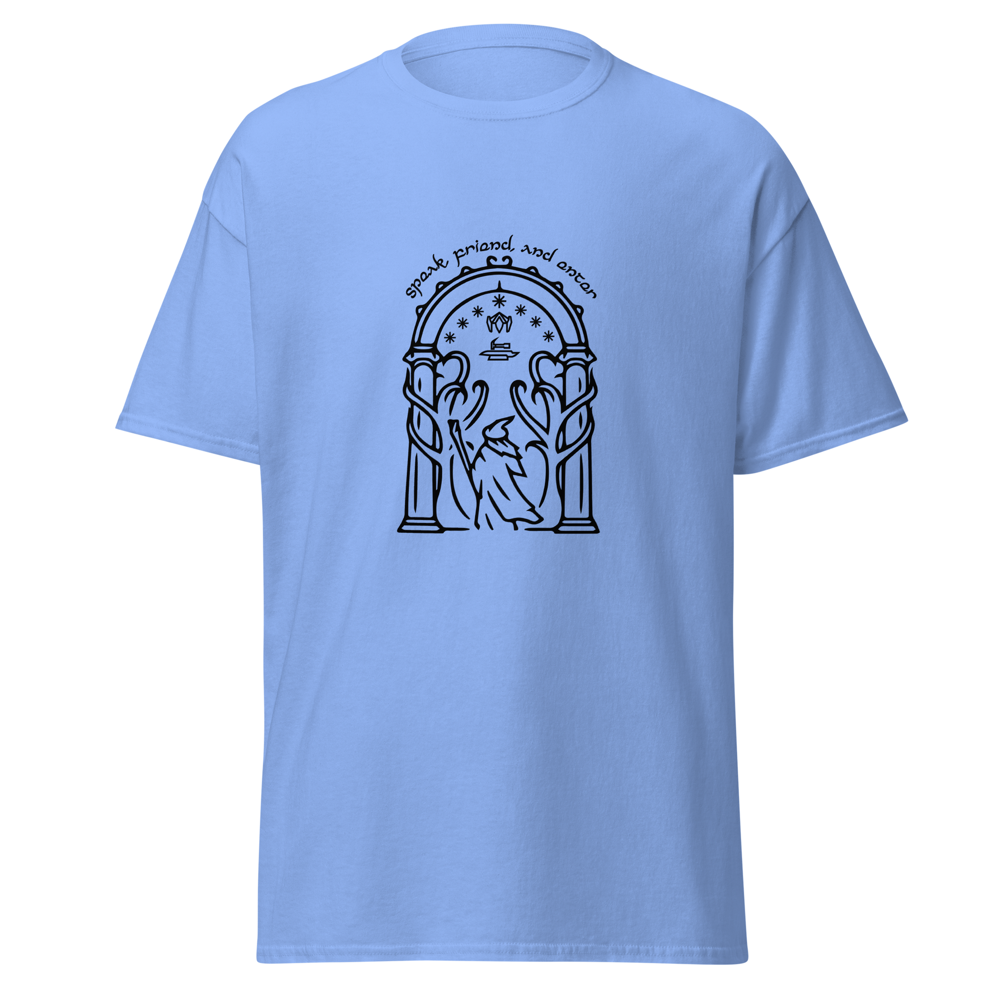 Discover the beauty of Durin's realm with our Doors of Durin T-Shirt. This captivating design captures the essence of the fabled doors. As a true fan of The Lord of the Rings, you can wear your passion proudly and make a statement wherever you go. Crafted for both style and comfort, our t-shirt is a must-have addition to your collection of fantasy-inspired apparel.