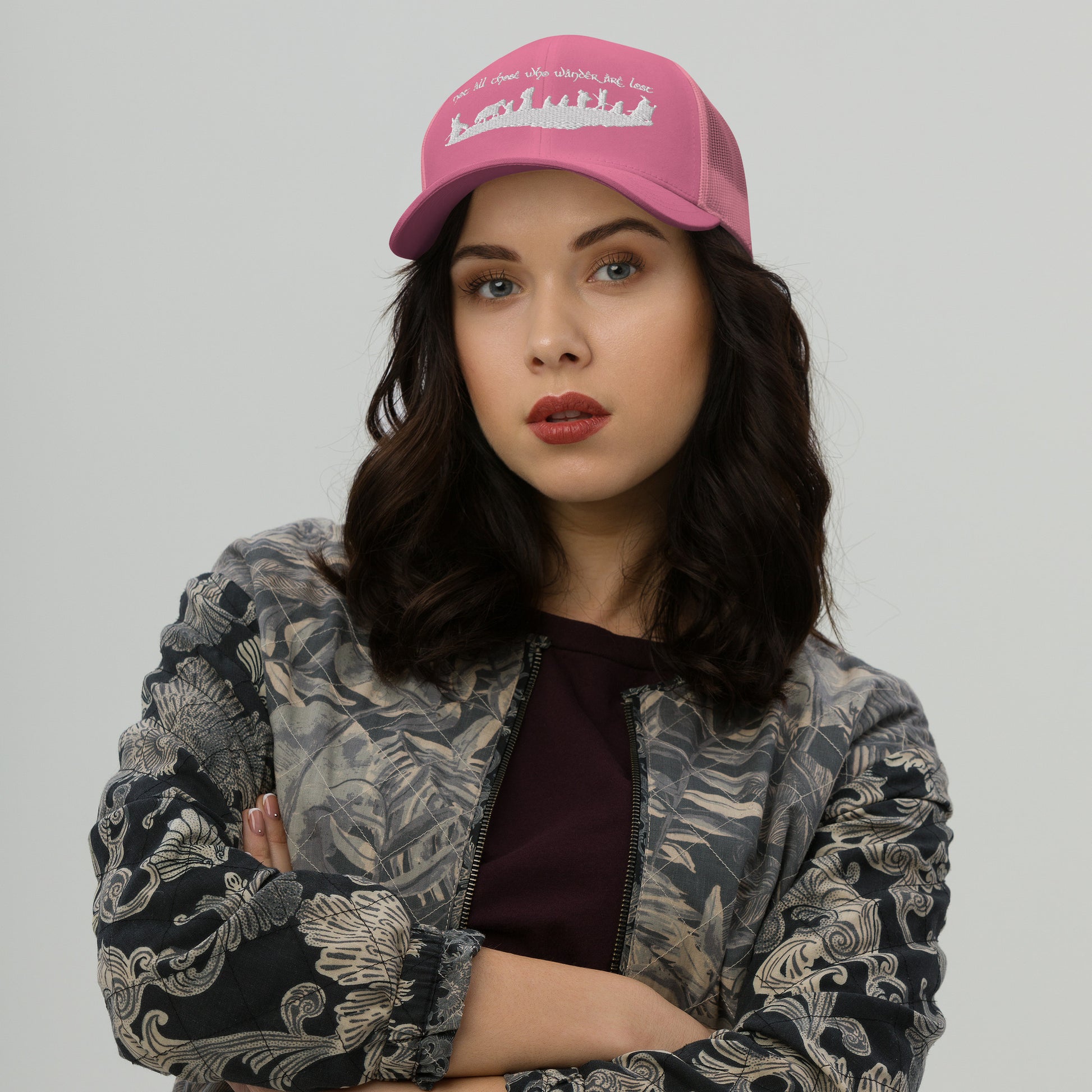 Embrace the spirit of adventure with our "Not All Those Who Wander Are Lost" Trucker Hat. Featuring the iconic silhouette of the Fellowship walking together and the inspiring quote "Not All Those Who Wander Are Lost," this six-panel trucker cap combines meaningful design with modern comfort. The hat’s mesh back ensures you stay cool and comfortable, making it perfect for sunny days and outdoor explorations. Ideal for fans of Middle-earth, this hat is a stylish reminder that true adventurers are never lost. Wear it proudly and let your journey begin.