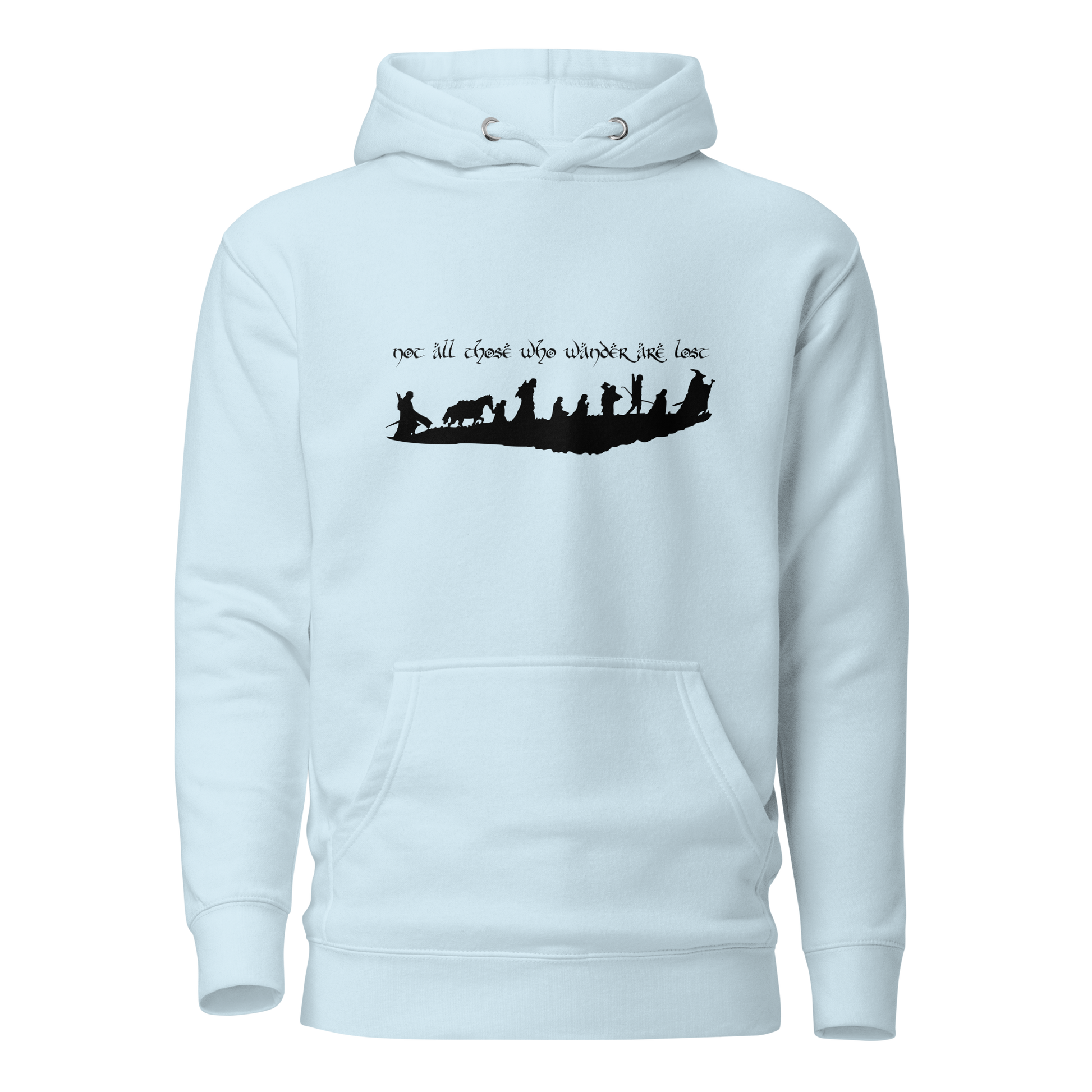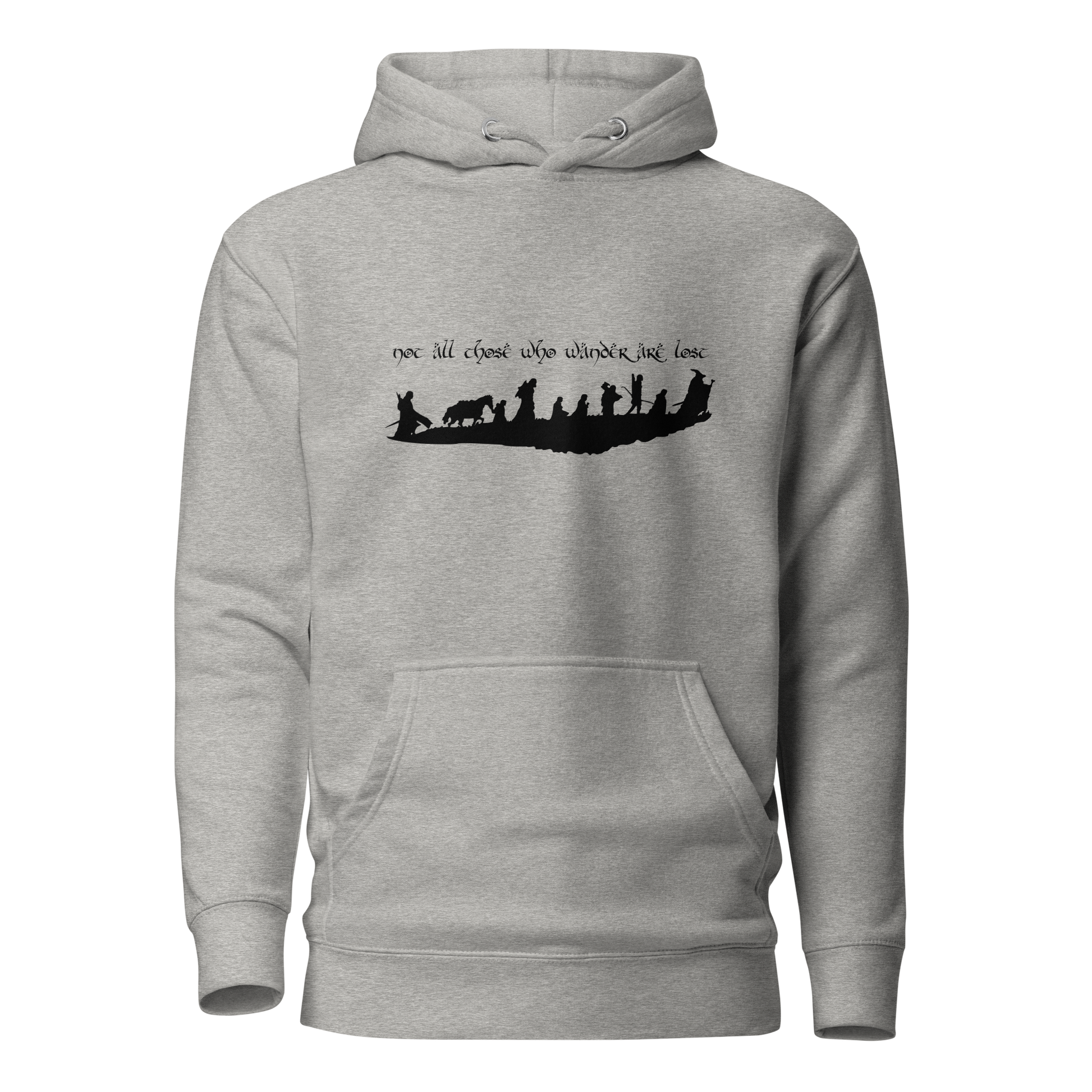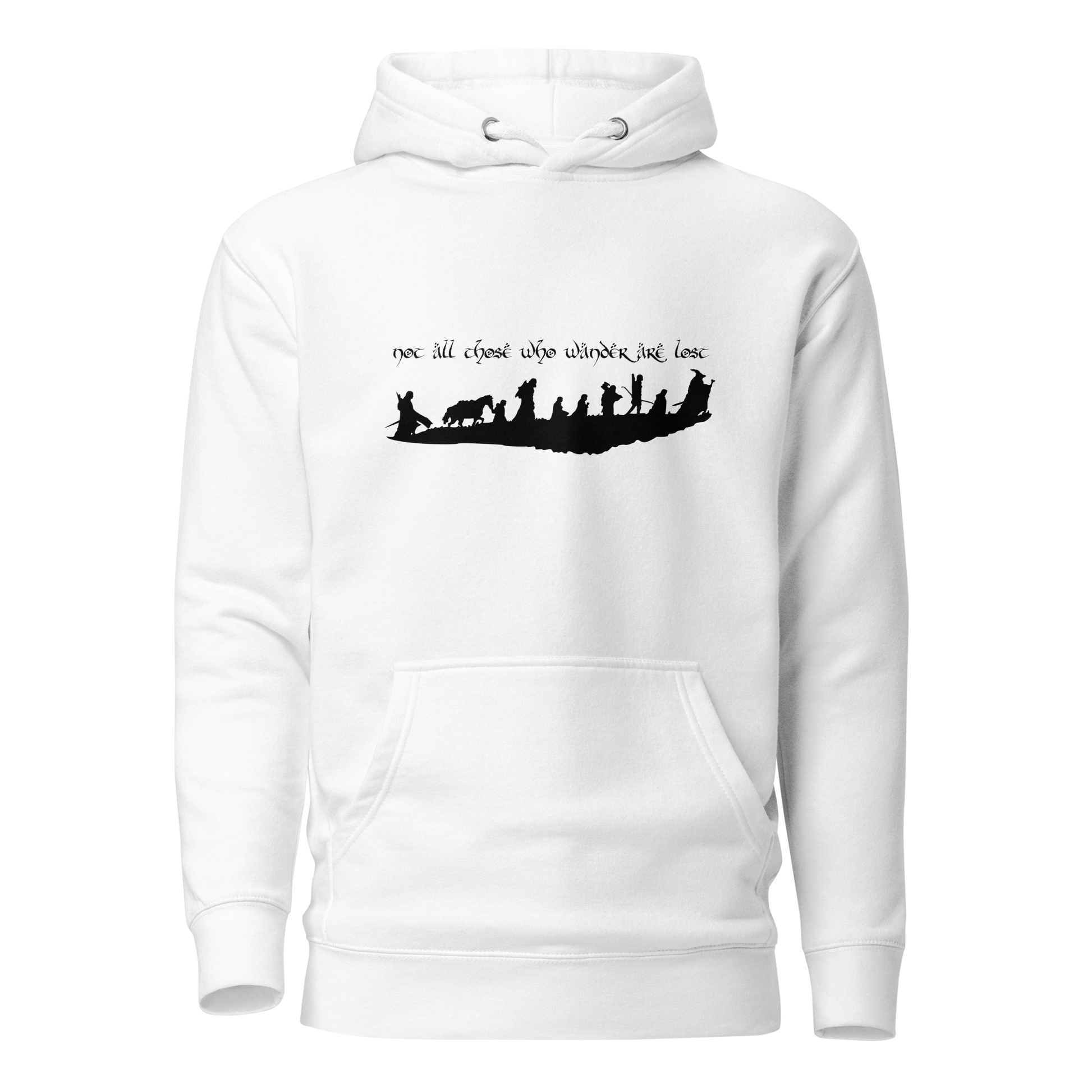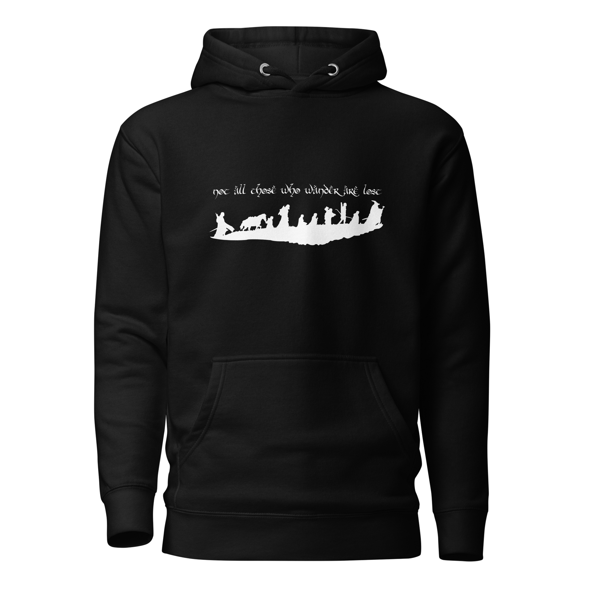 Embark on a journey with our Fellowship Silhouette Hoodie, a tribute to the unity and courage of the iconic members of the fellowship. Against the backdrop of Middle-earth's horizon, their silhouettes walk in steadfast unity, echoing the spirit of adventure and friendship. The quote "Not all those who wander are lost" stands as a reminder that every path, though uncharted, has its purpose. Crafted for comfort and warmth, this hoodie celebrates the timeless message of The Lord of the Rings.