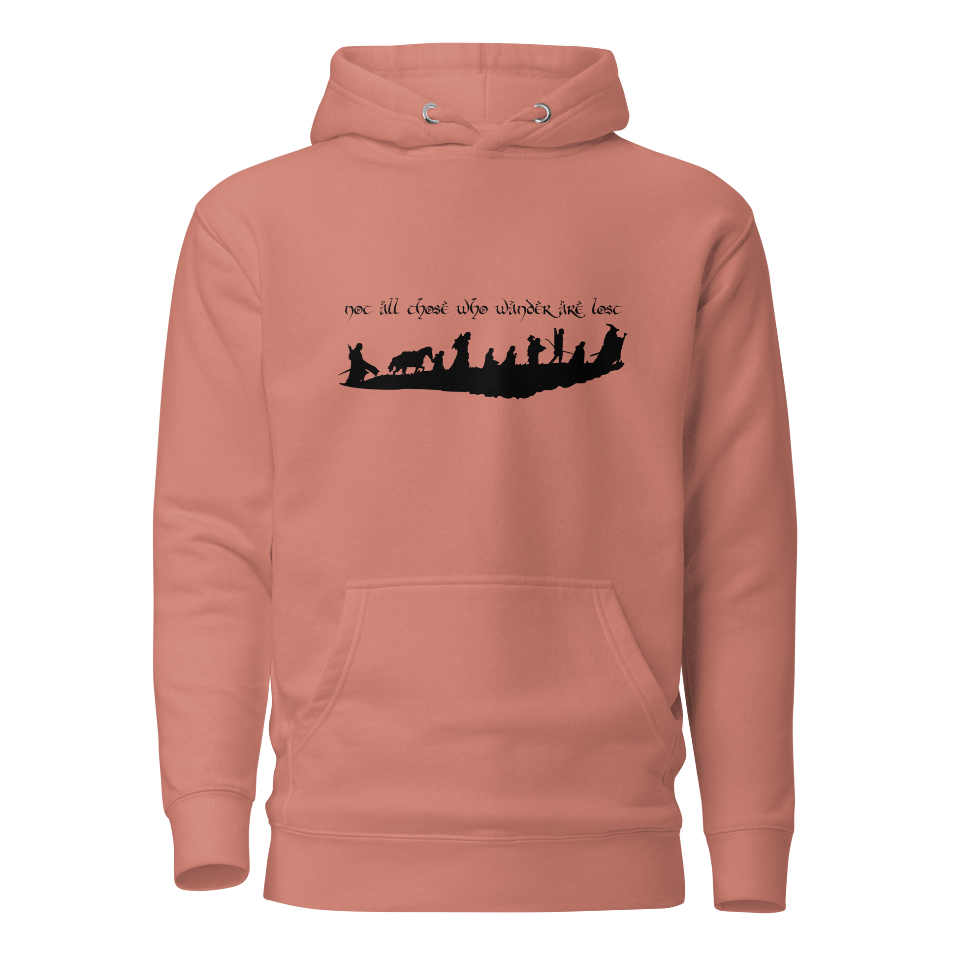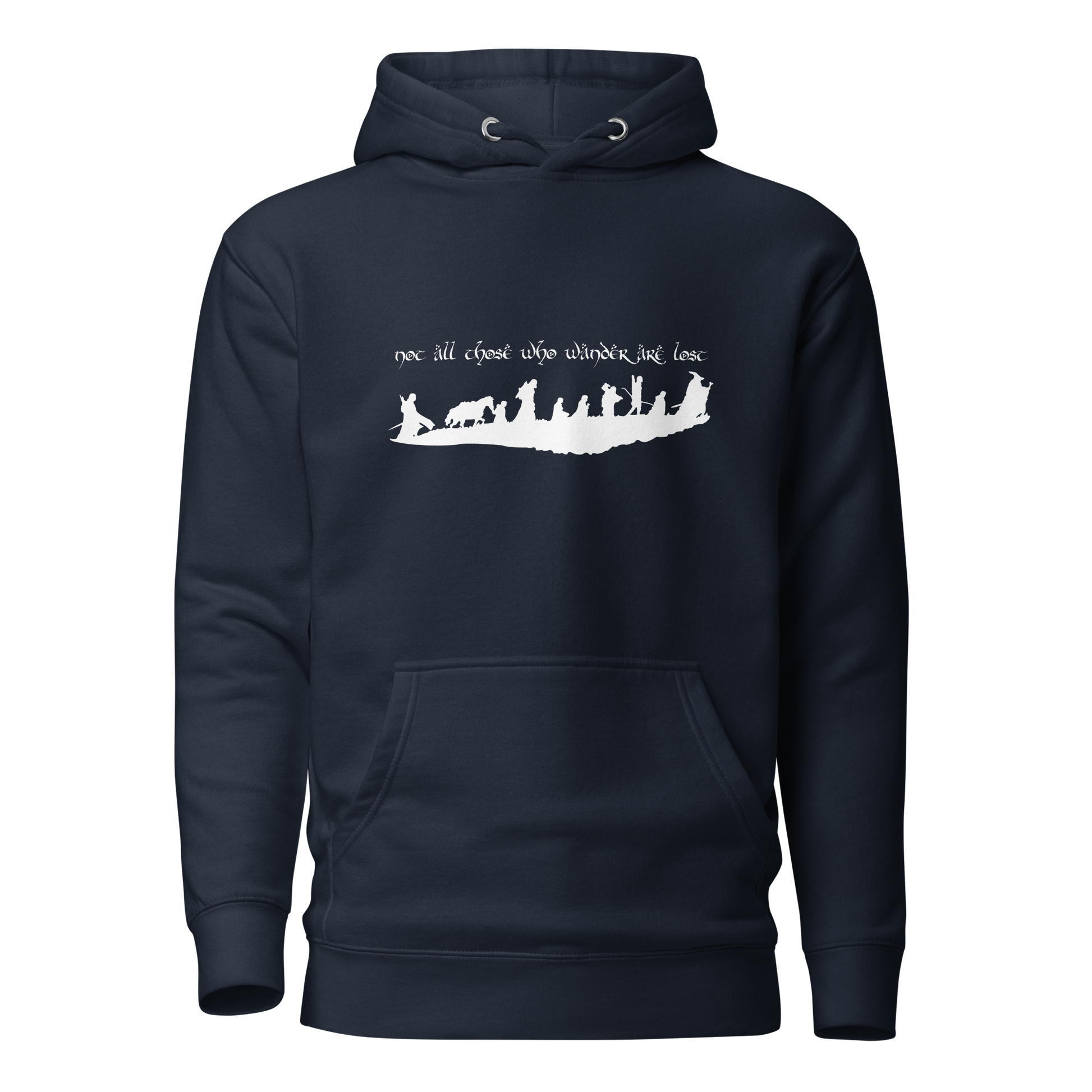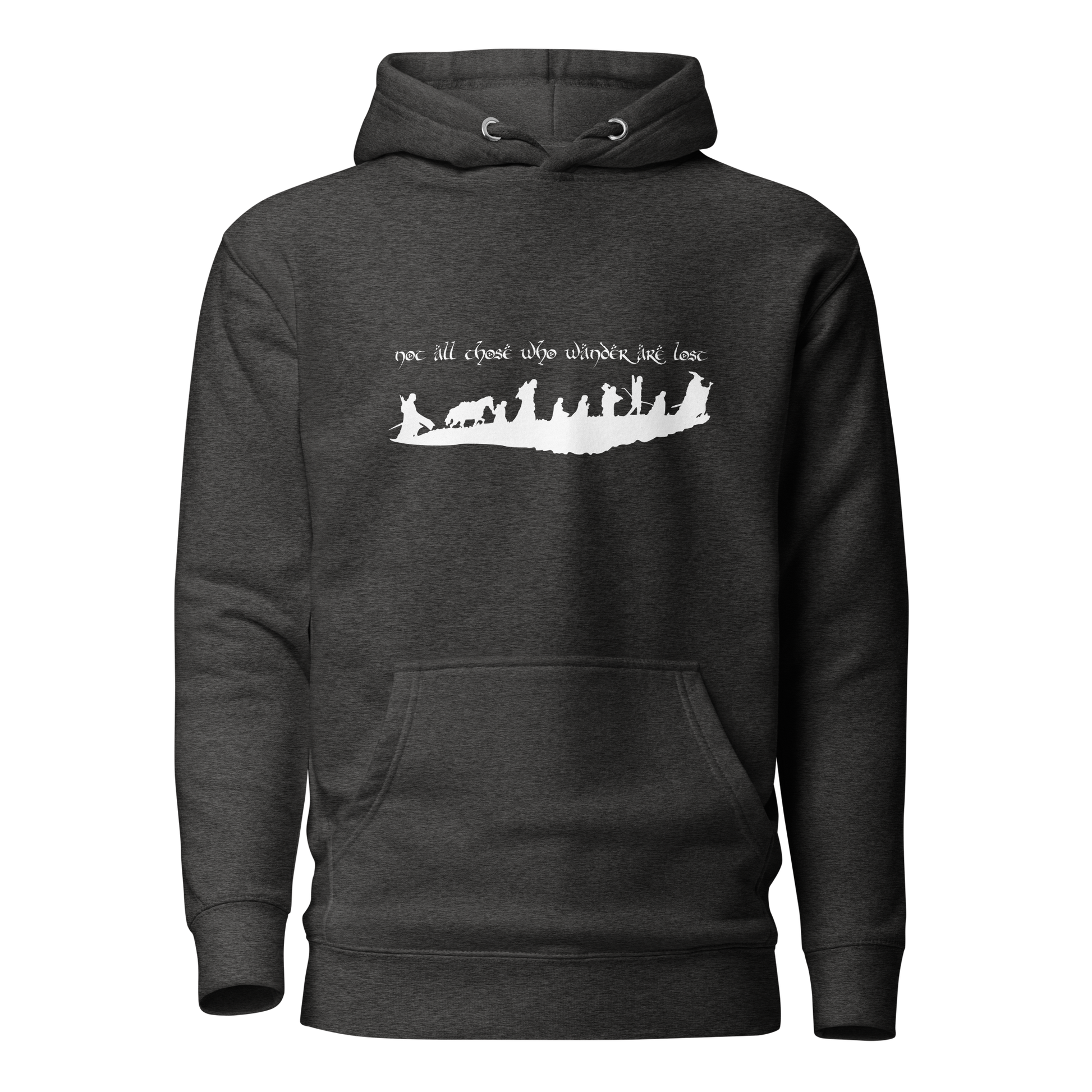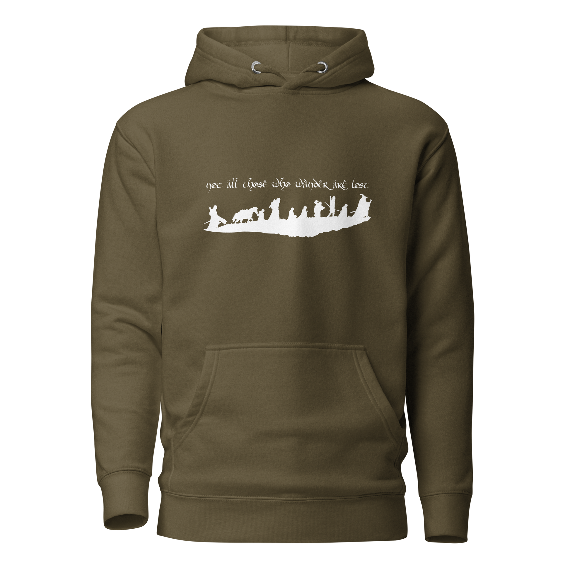 Embark on a journey with our Fellowship Silhouette Hoodie, a tribute to the unity and courage of the iconic members of the fellowship. Against the backdrop of Middle-earth's horizon, their silhouettes walk in steadfast unity, echoing the spirit of adventure and friendship. The quote "Not all those who wander are lost" stands as a reminder that every path, though uncharted, has its purpose. Crafted for comfort and warmth, this hoodie celebrates the timeless message of The Lord of the Rings.