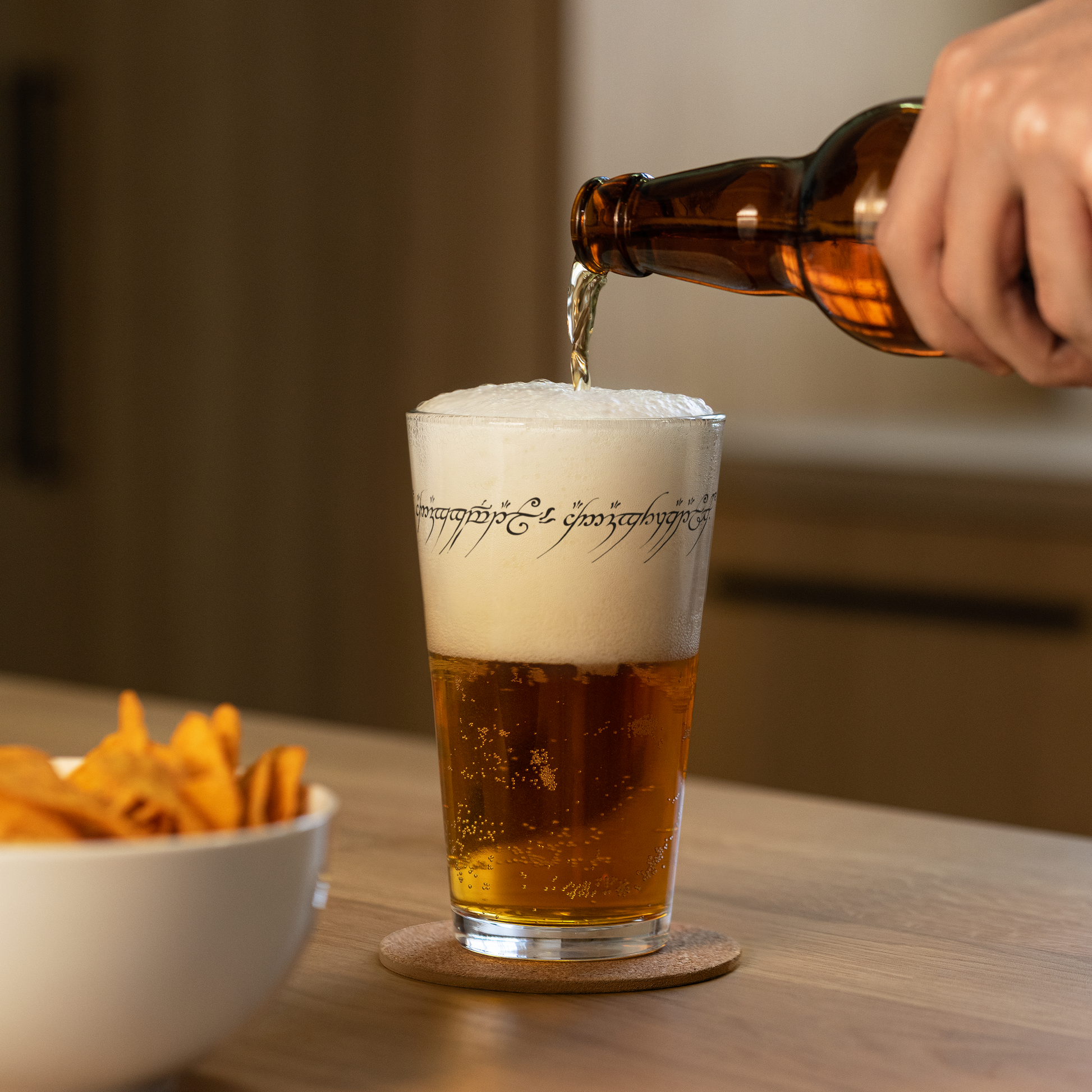 Elevate your drinking experience with our One Ring Inscription Pint Glass. This exquisite glassware is a tribute to the legendary world of Middle-earth, where epic tales and grand adventures come to life. Crafted with precision and care, it features the iconic One Ring inscription encircling the glass, creating a mesmerizing visual experience.