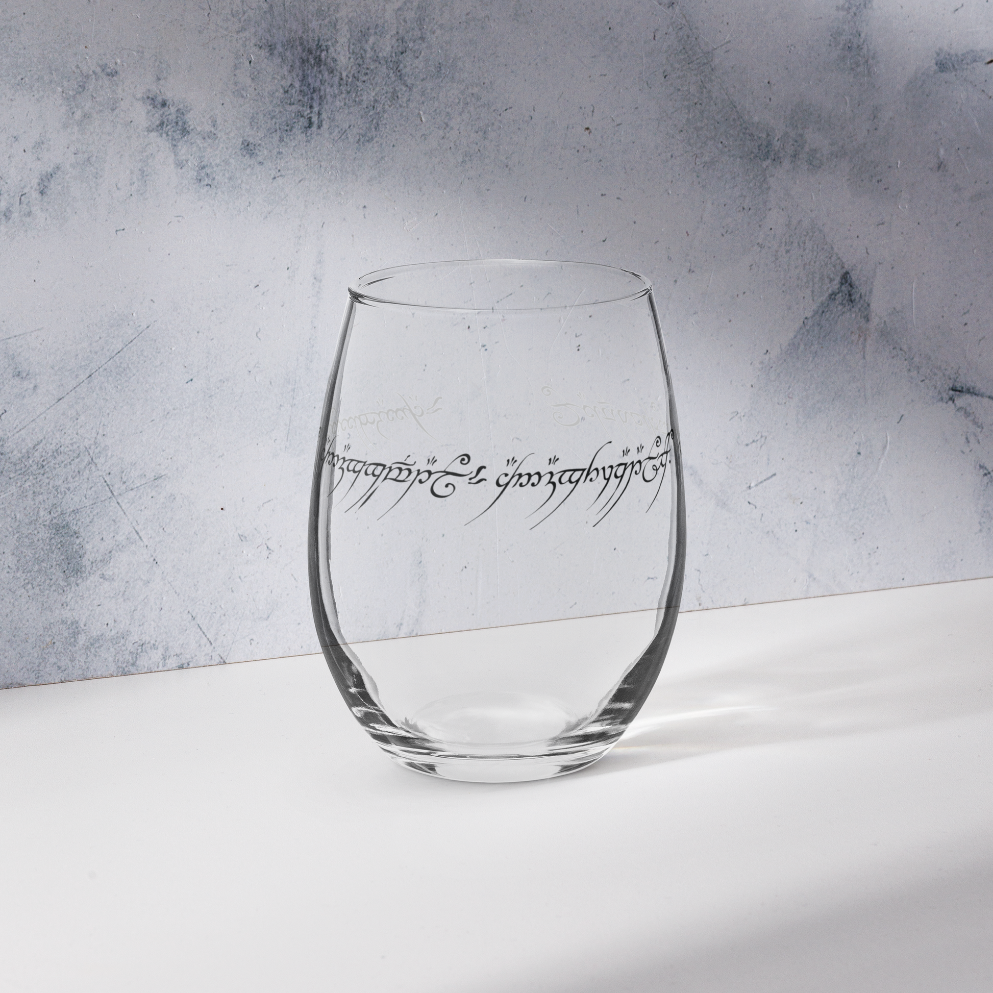 Sip your favorite wines in the enchanting elegance of Middle-earth with our One Ring Inscription Stemless Wine Glass. This captivating glassware pays homage to the timeless tales of Tolkien, featuring the iconic One Ring inscription expertly printed for a visual masterpiece that brings the magic of "The Lord of the Rings" to your wine moments.