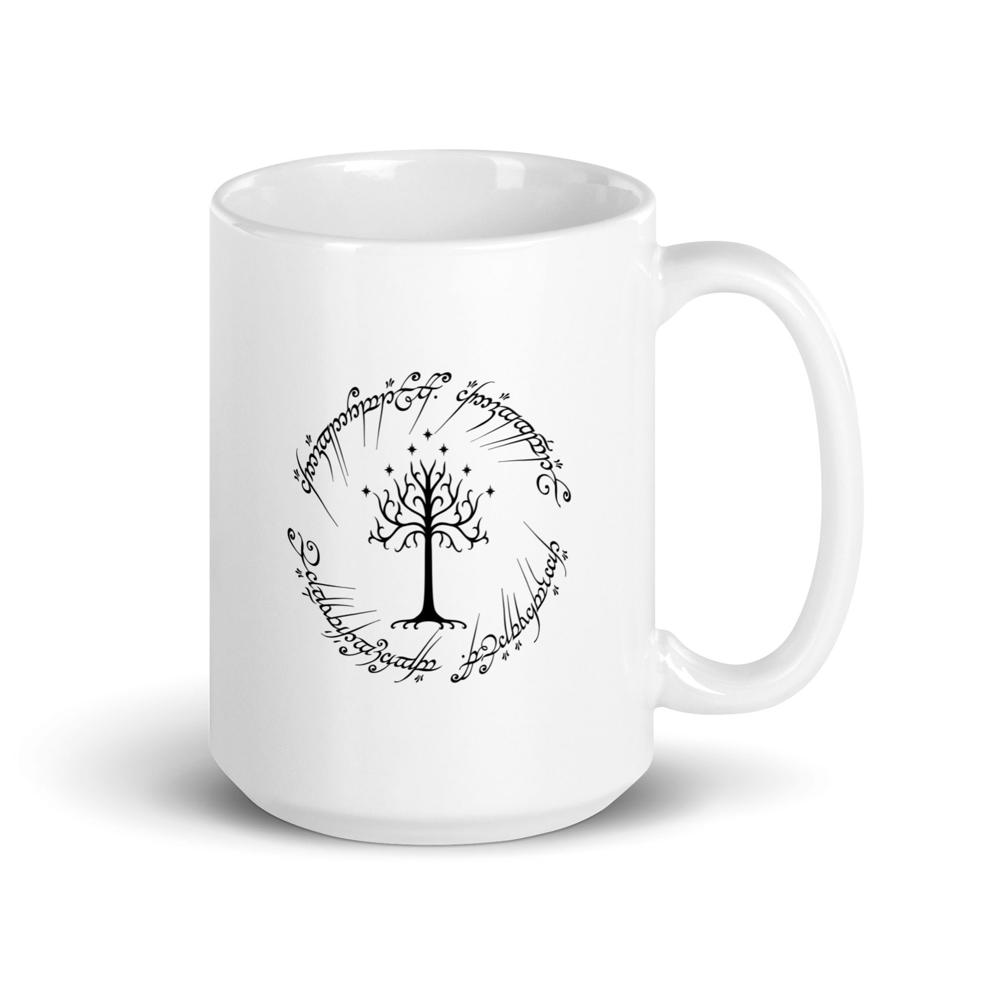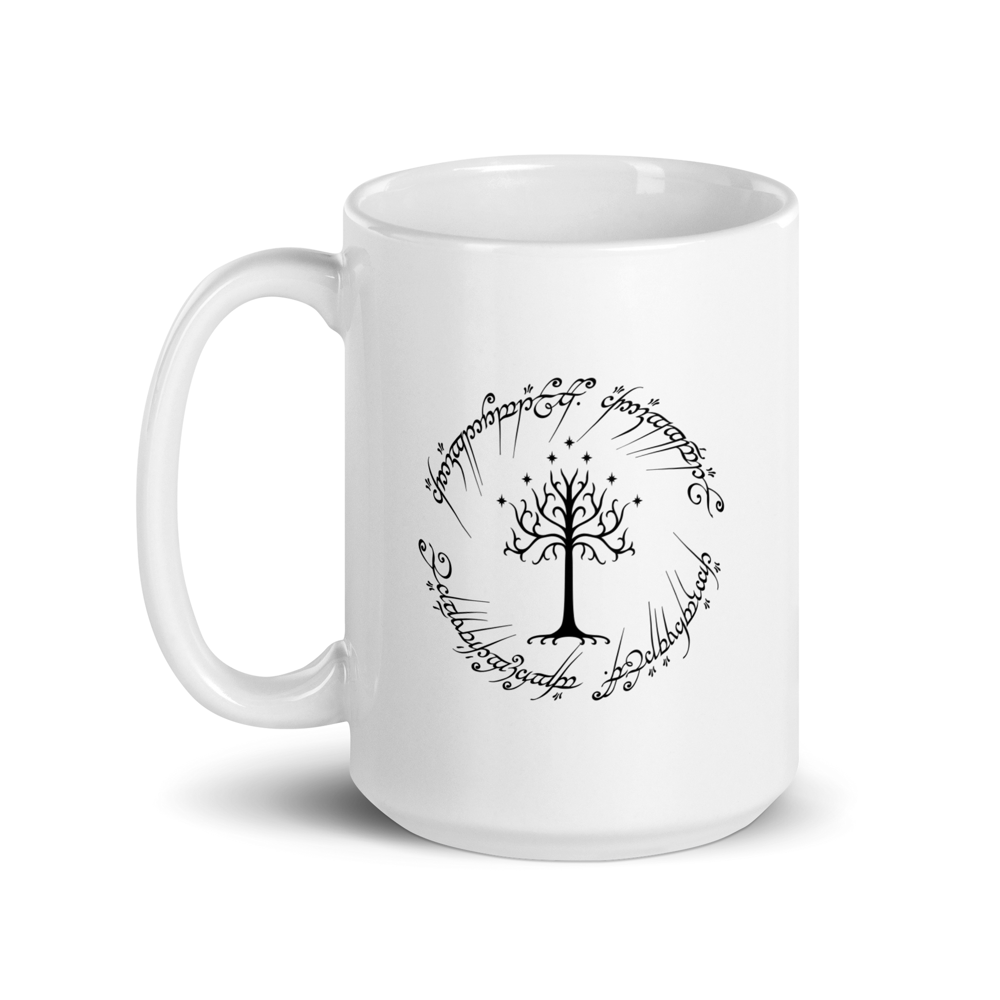 Savor the magic of The Lord of the Rings with every sip from our Round Inscription Mug. Featuring the iconic circular writing of the One Ring, elegantly intertwined with the White Tree of Gondor, this mug is a tribute to two timeless symbols. Let your morning coffee or evening tea transport you to the realms of Middle-earth, where tales of heroism and fantasy unfold. With each use, this mug celebrates the rich mythology and artistry of Tolkien's world..