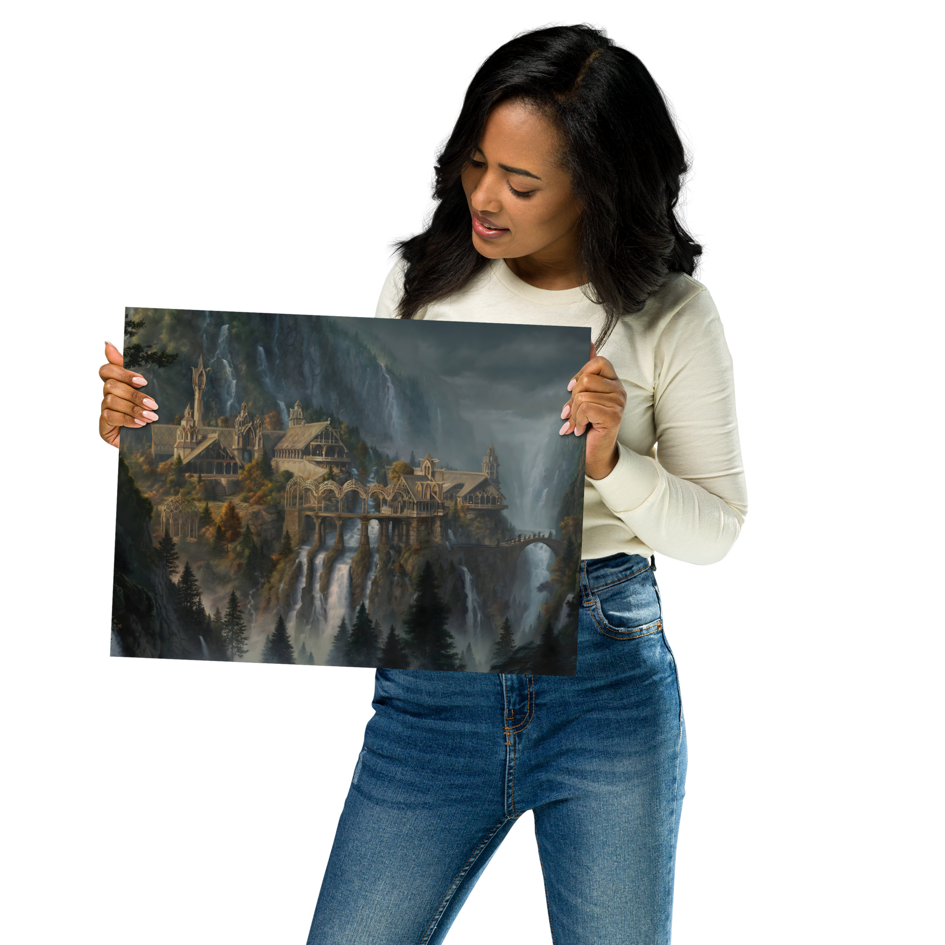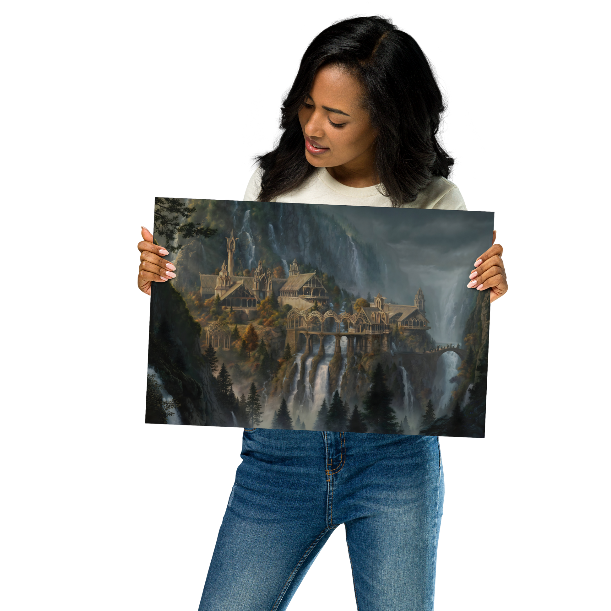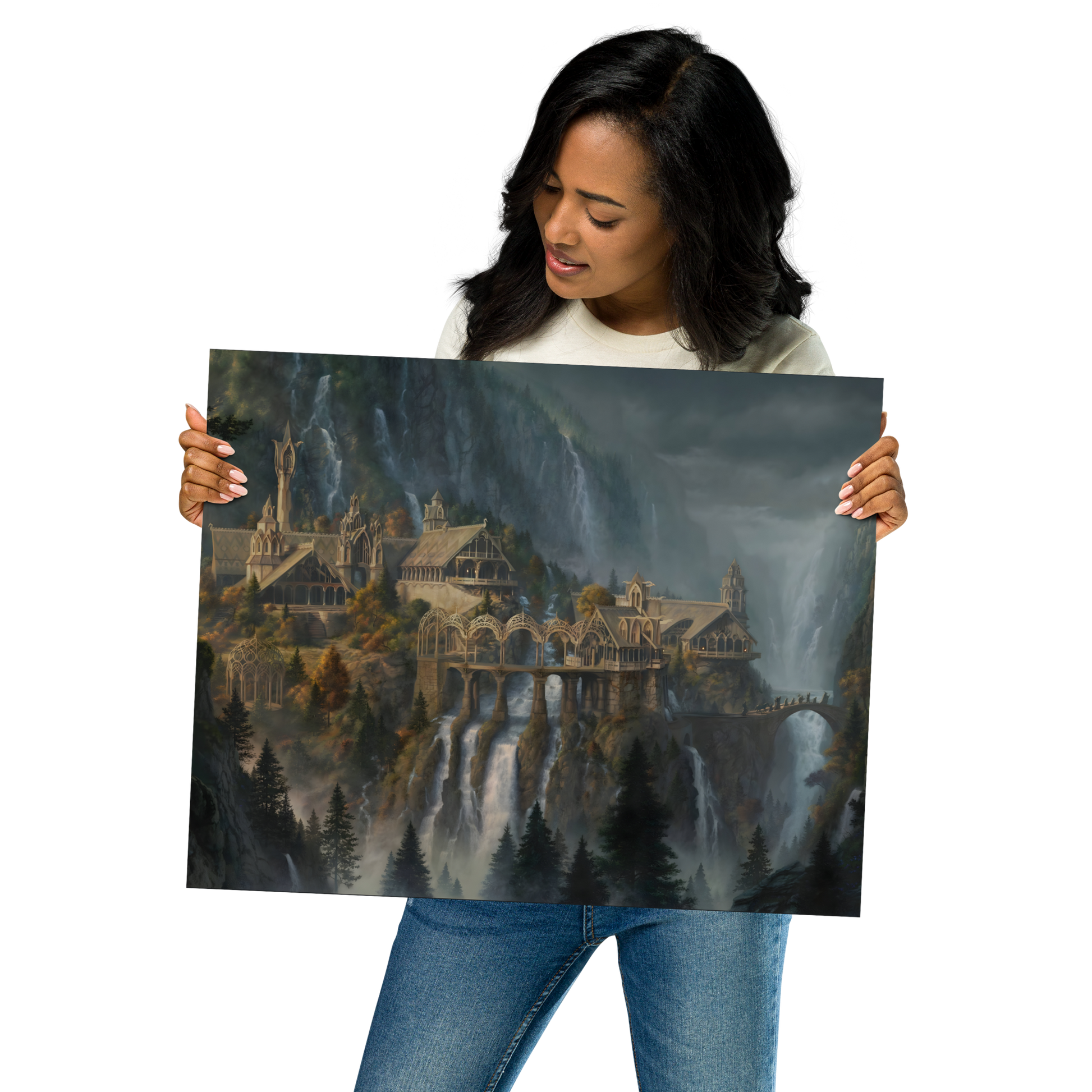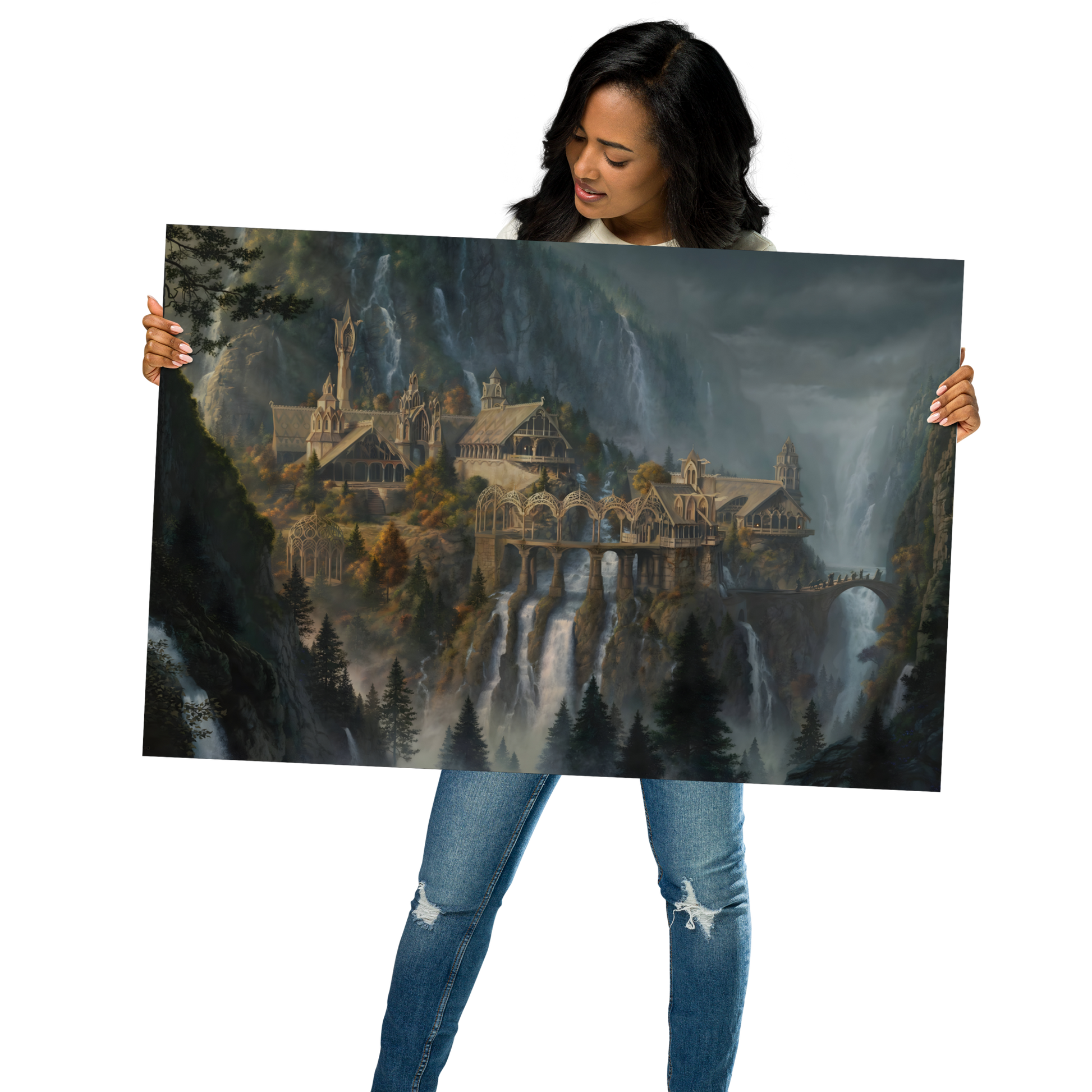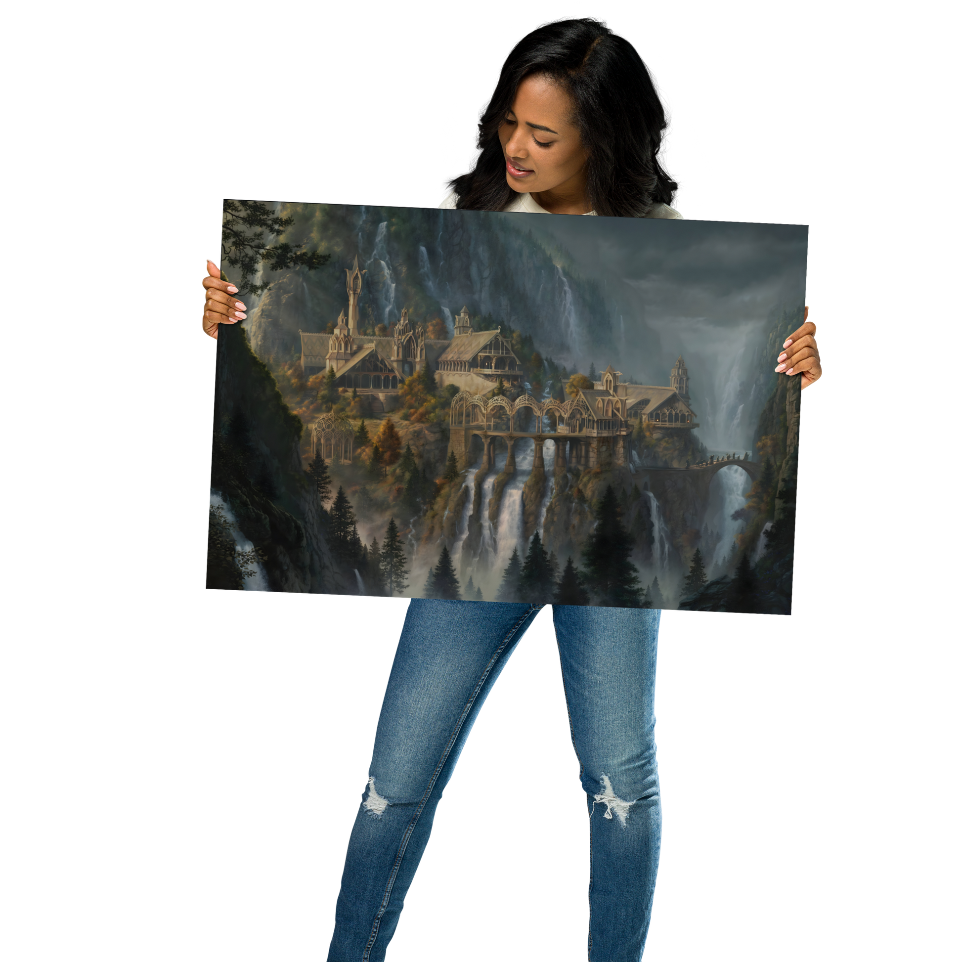 Step into the enchanting realm of Middle-earth with our Rivendell Poster, a stunning homage to one of the most iconic locations from J.R.R. Tolkien's masterpieces. Rivendell, the hidden refuge of the Elves, is beautifully depicted in intricate detail, capturing the ethereal beauty and timeless allure of this mystical place.