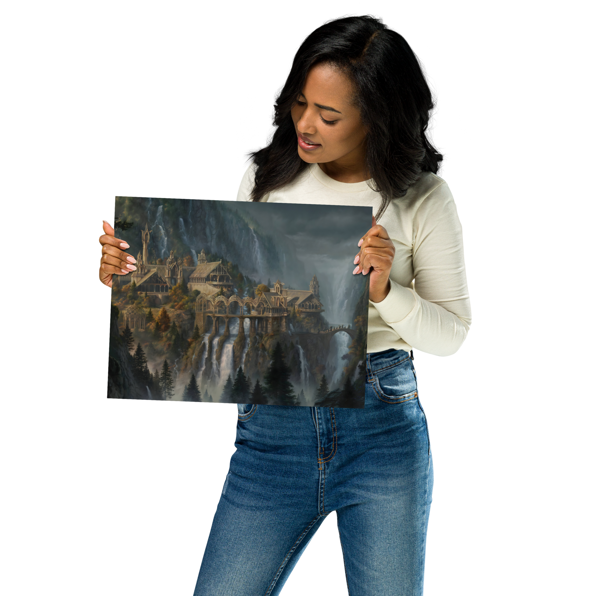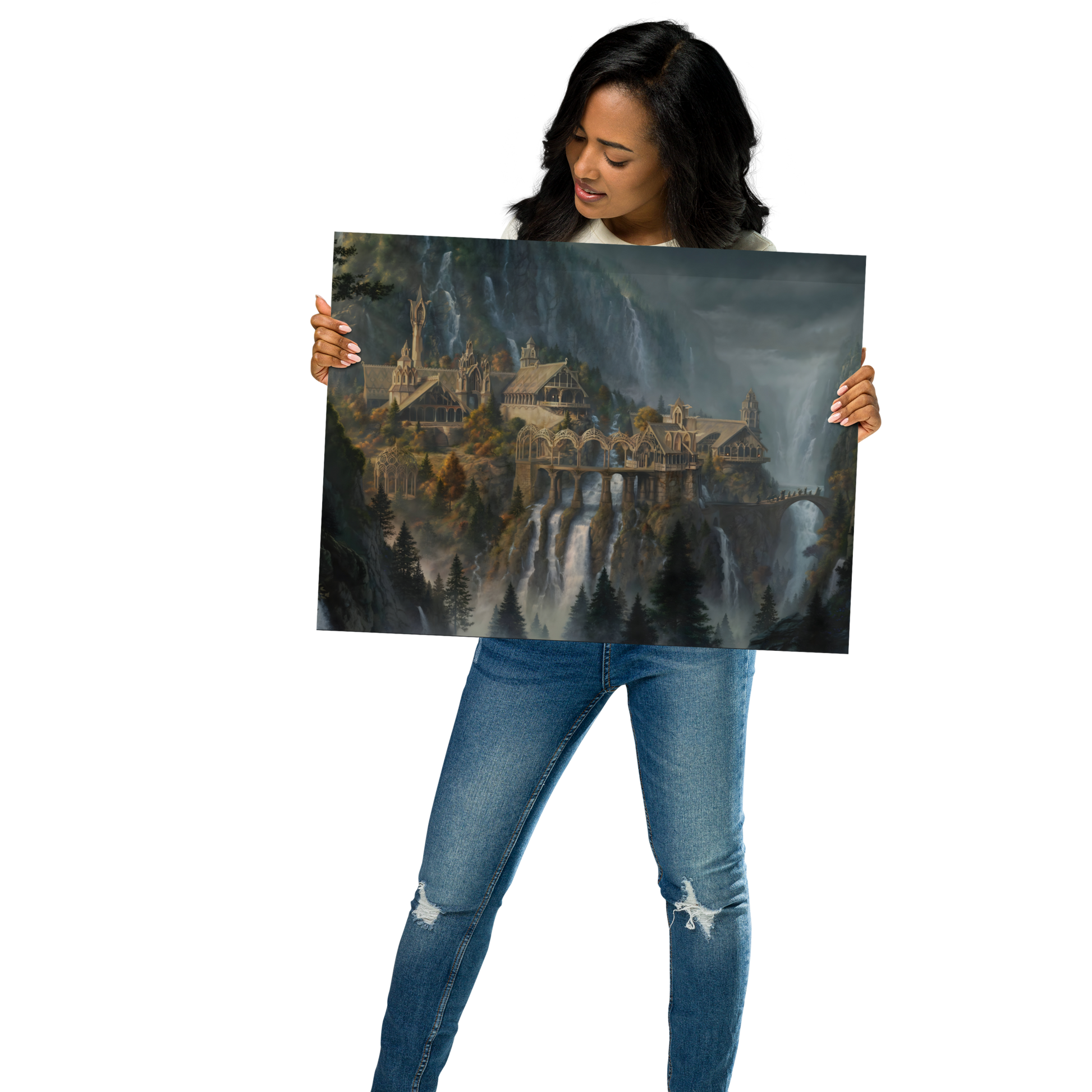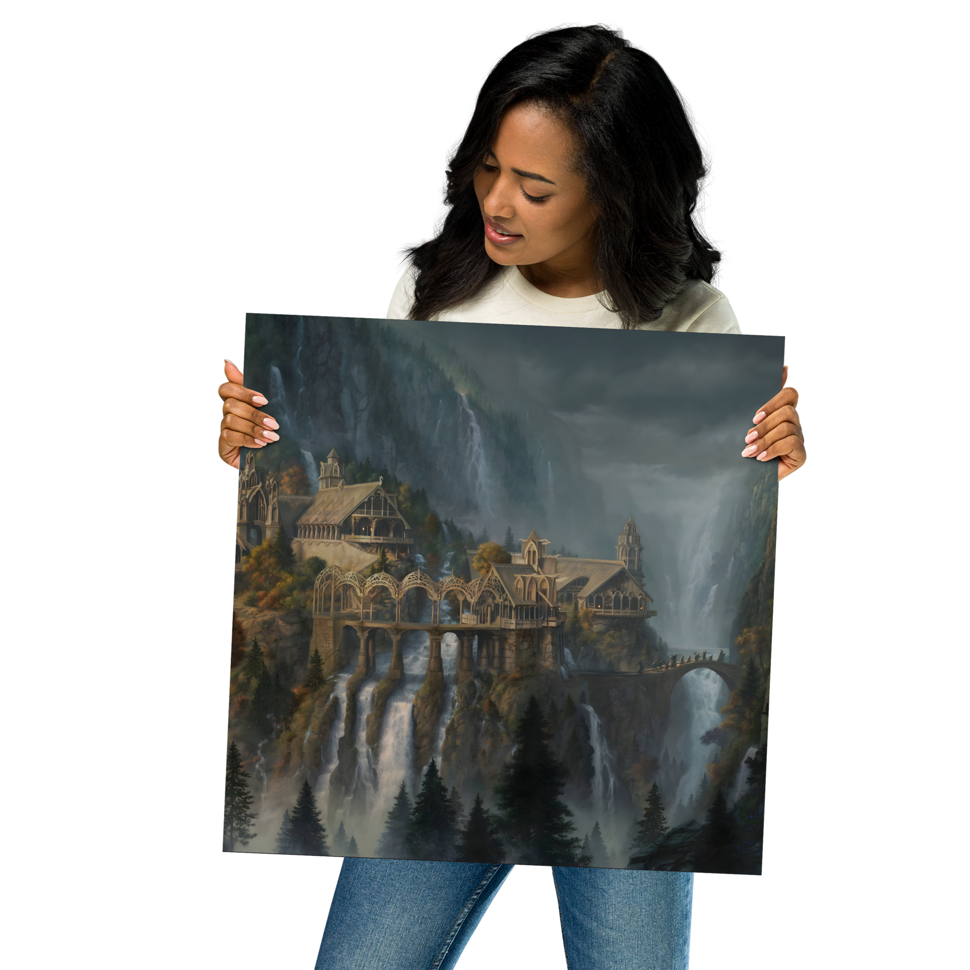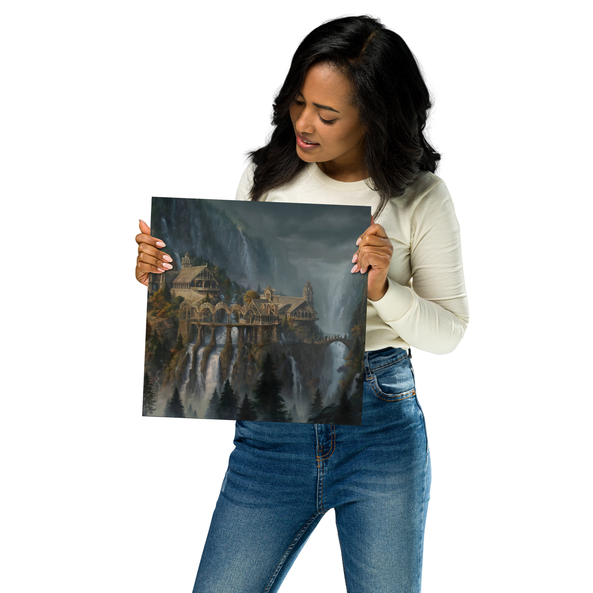 Step into the enchanting realm of Middle-earth with our Rivendell Poster, a stunning homage to one of the most iconic locations from J.R.R. Tolkien's masterpieces. Rivendell, the hidden refuge of the Elves, is beautifully depicted in intricate detail, capturing the ethereal beauty and timeless allure of this mystical place.