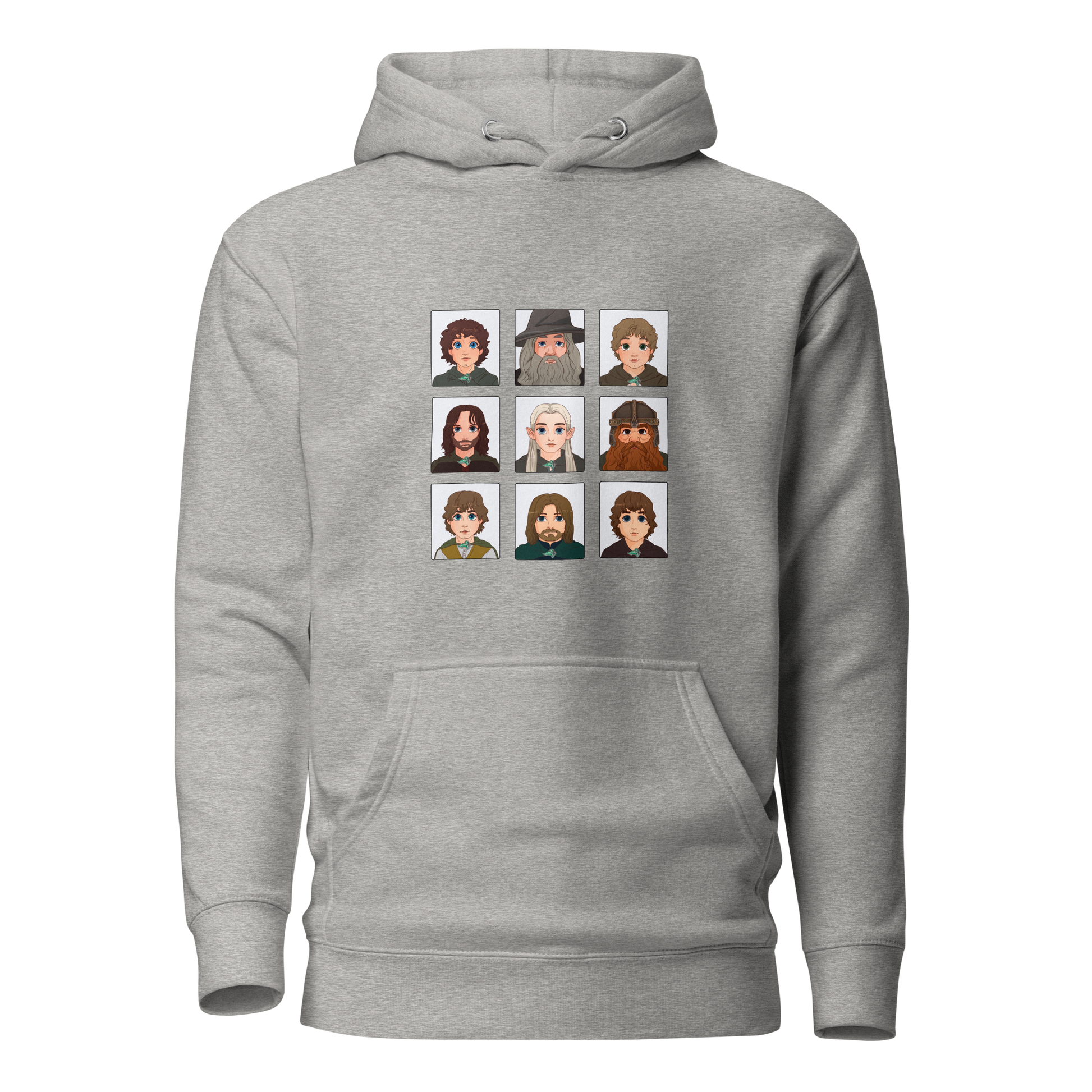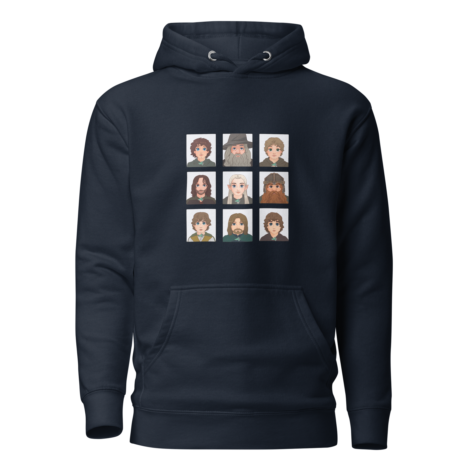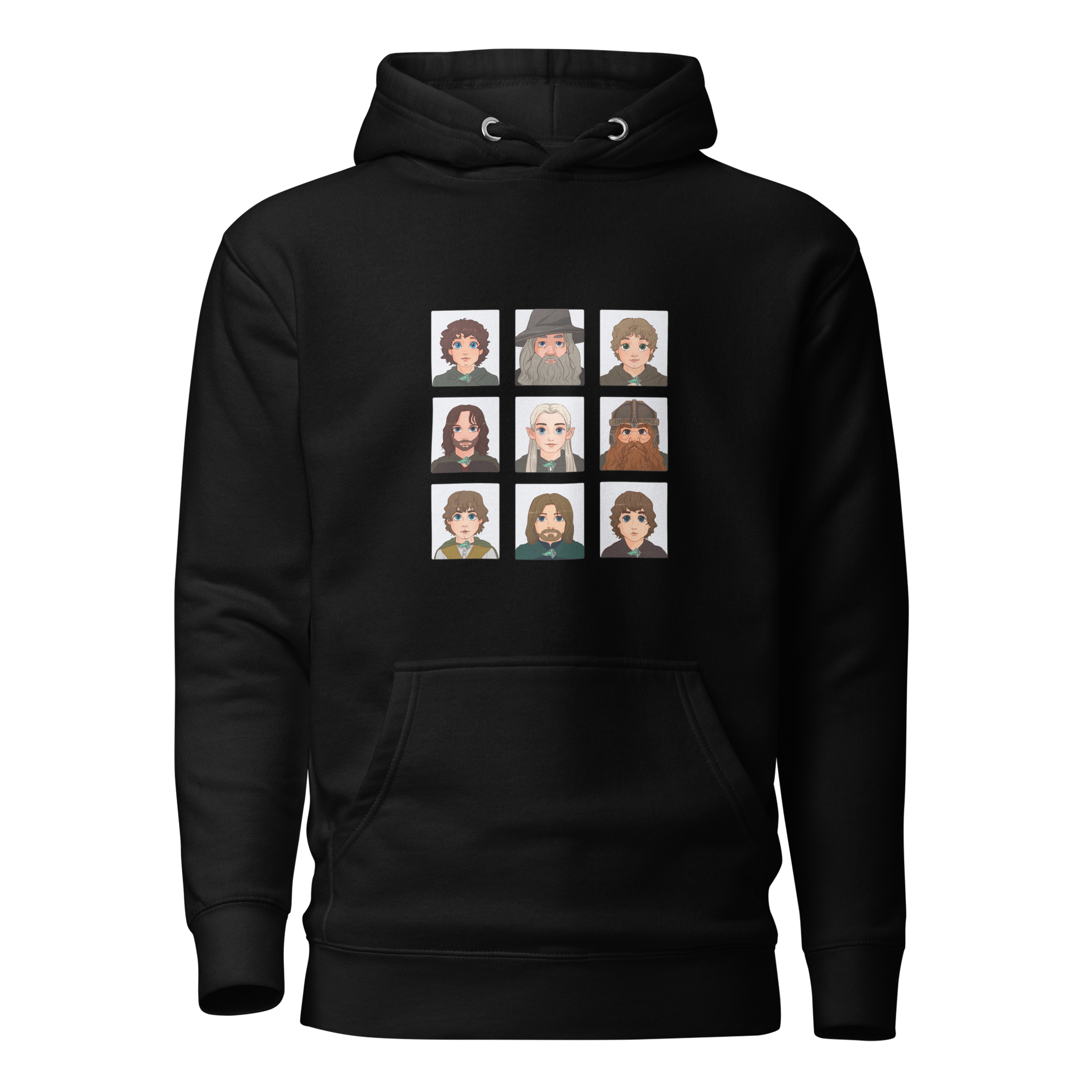 Celebrate the unbreakable bond of "The Fellowship" with our charming and slightly cartoonish design. The nine members come to life in a style that captures their essence and camaraderie. This hoodie is a heartwarming tribute to the legendary companions who embarked on an epic quest. Stay cozy and connected to the spirit of unity with this hoodie, a perfect blend of artistry and fandom.