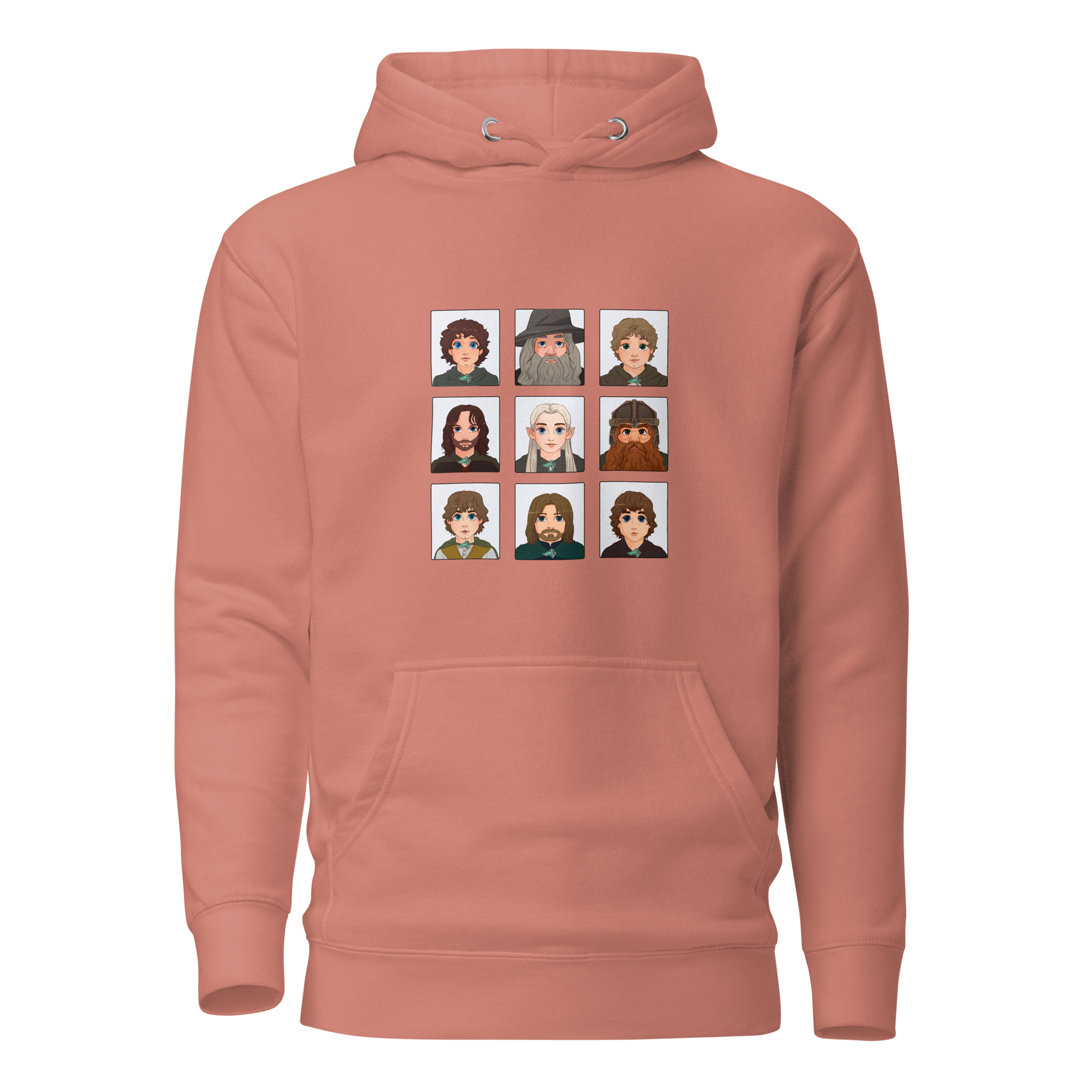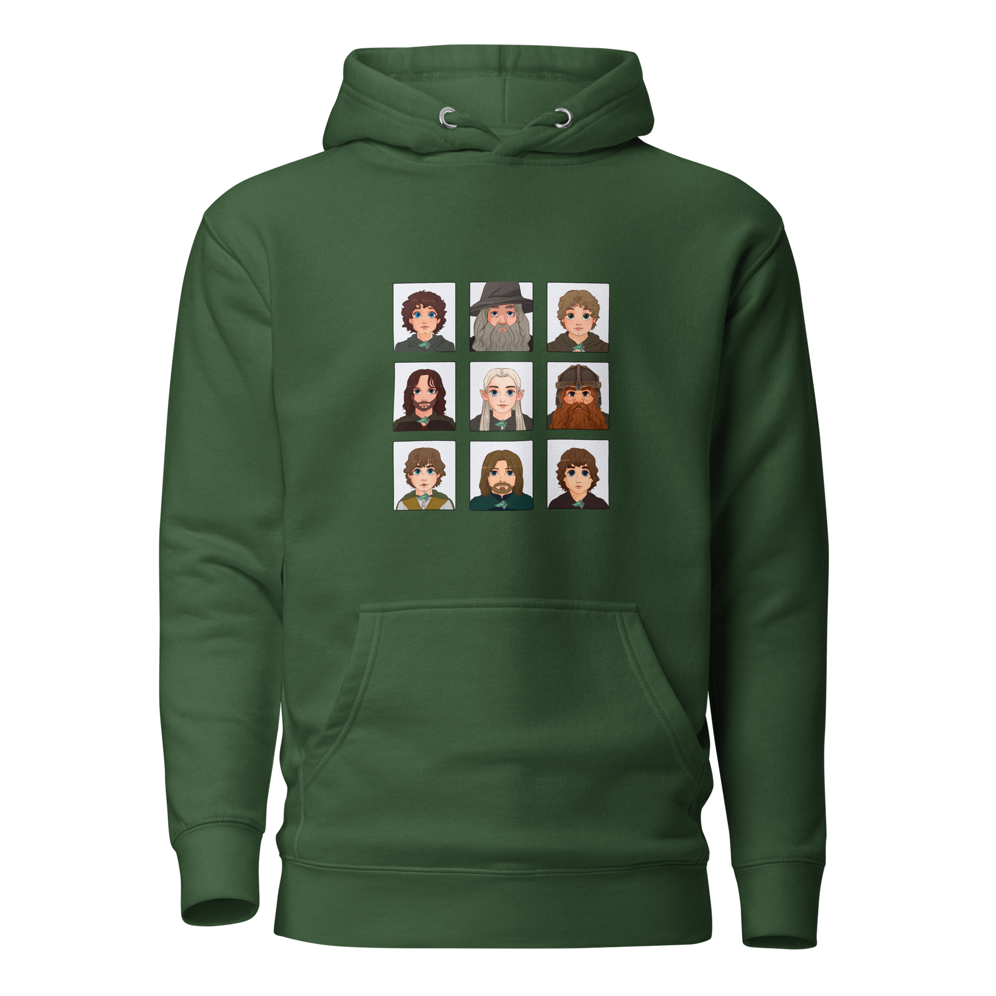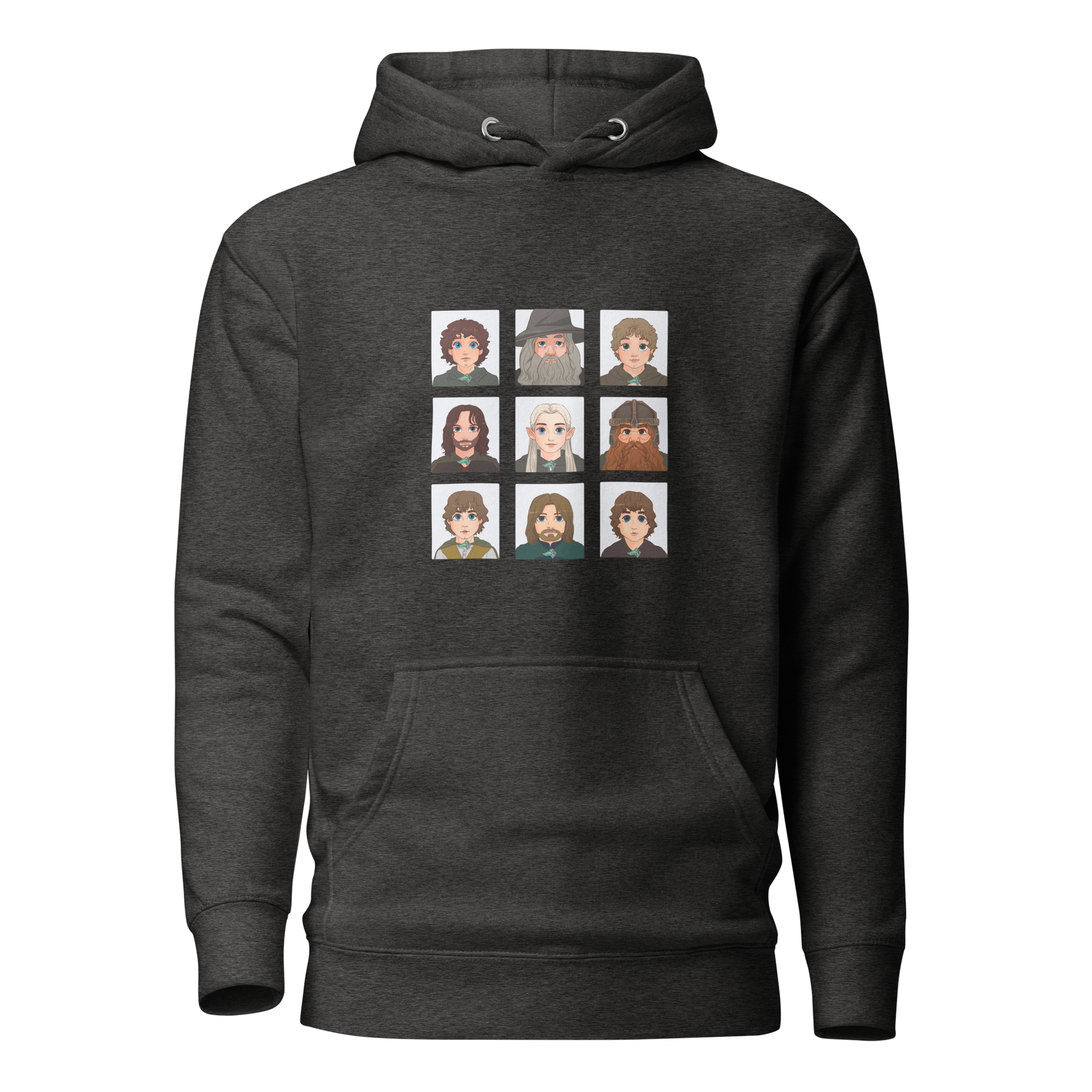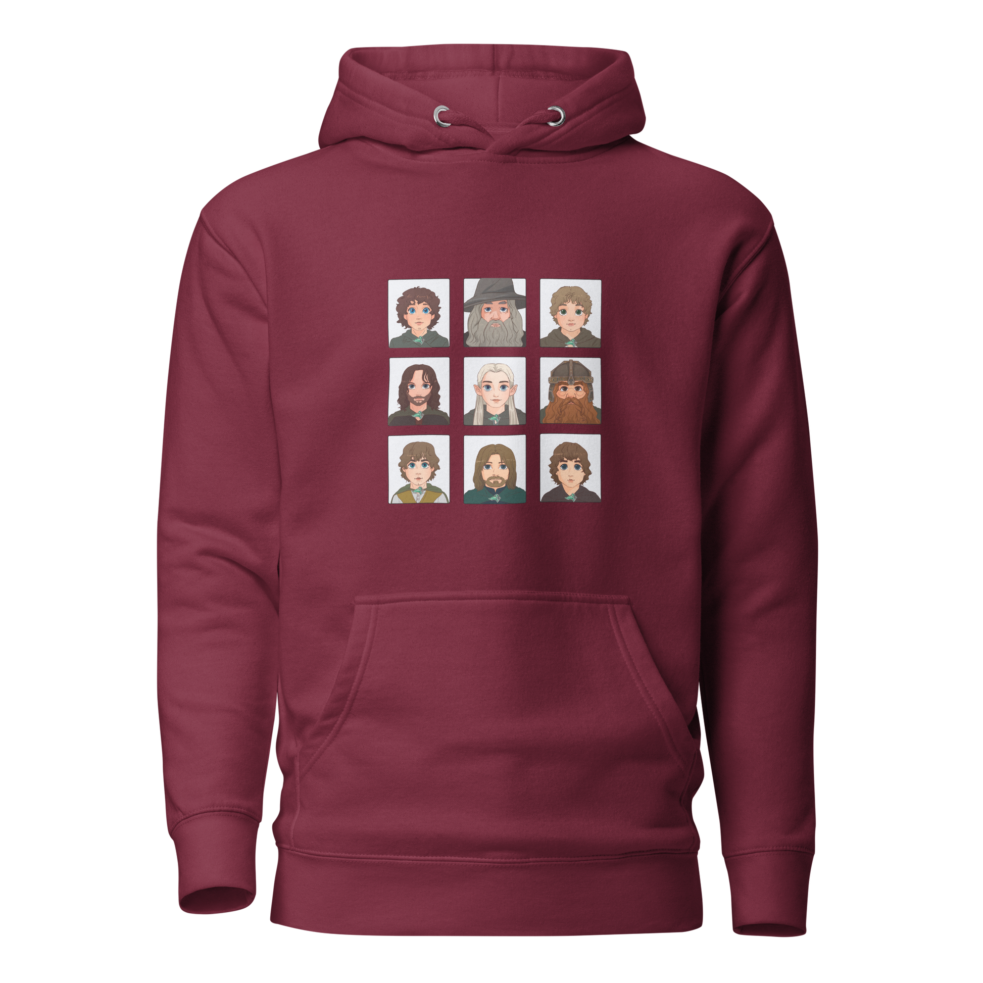 Celebrate the unbreakable bond of "The Fellowship" with our charming and slightly cartoonish design. The nine members come to life in a style that captures their essence and camaraderie. This hoodie is a heartwarming tribute to the legendary companions who embarked on an epic quest. Stay cozy and connected to the spirit of unity with this hoodie, a perfect blend of artistry and fandom.