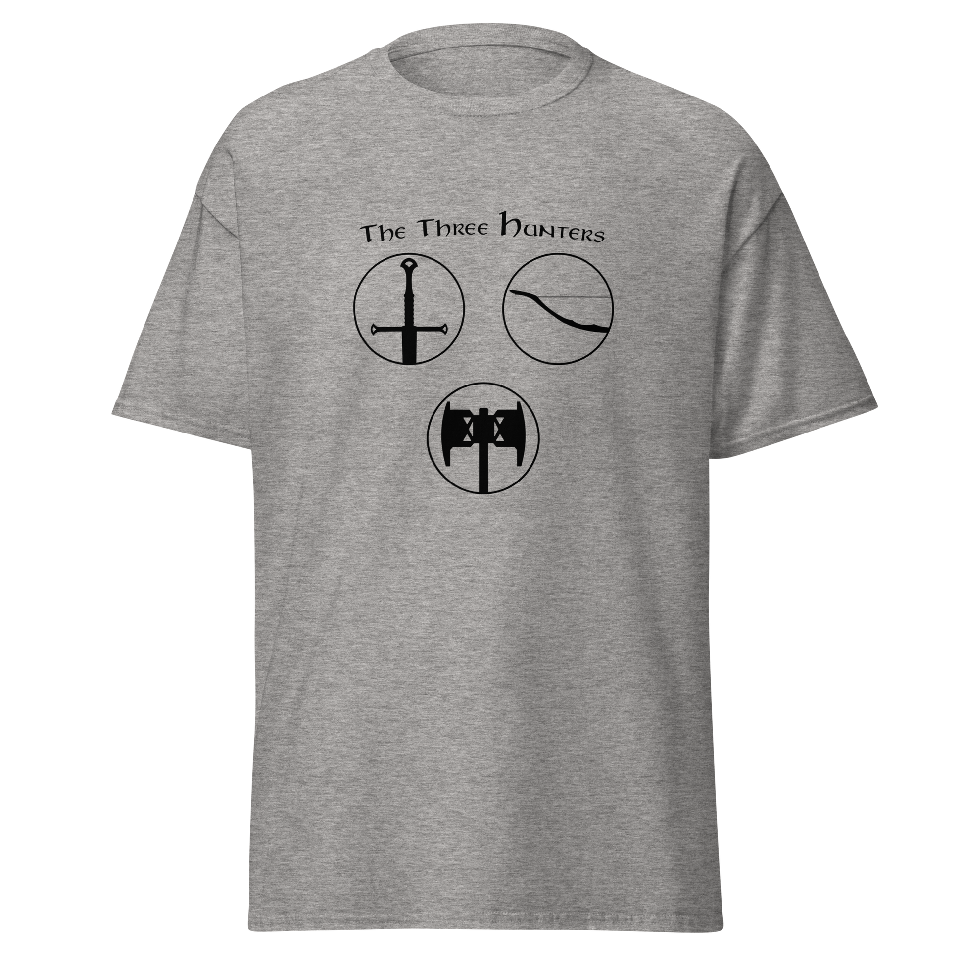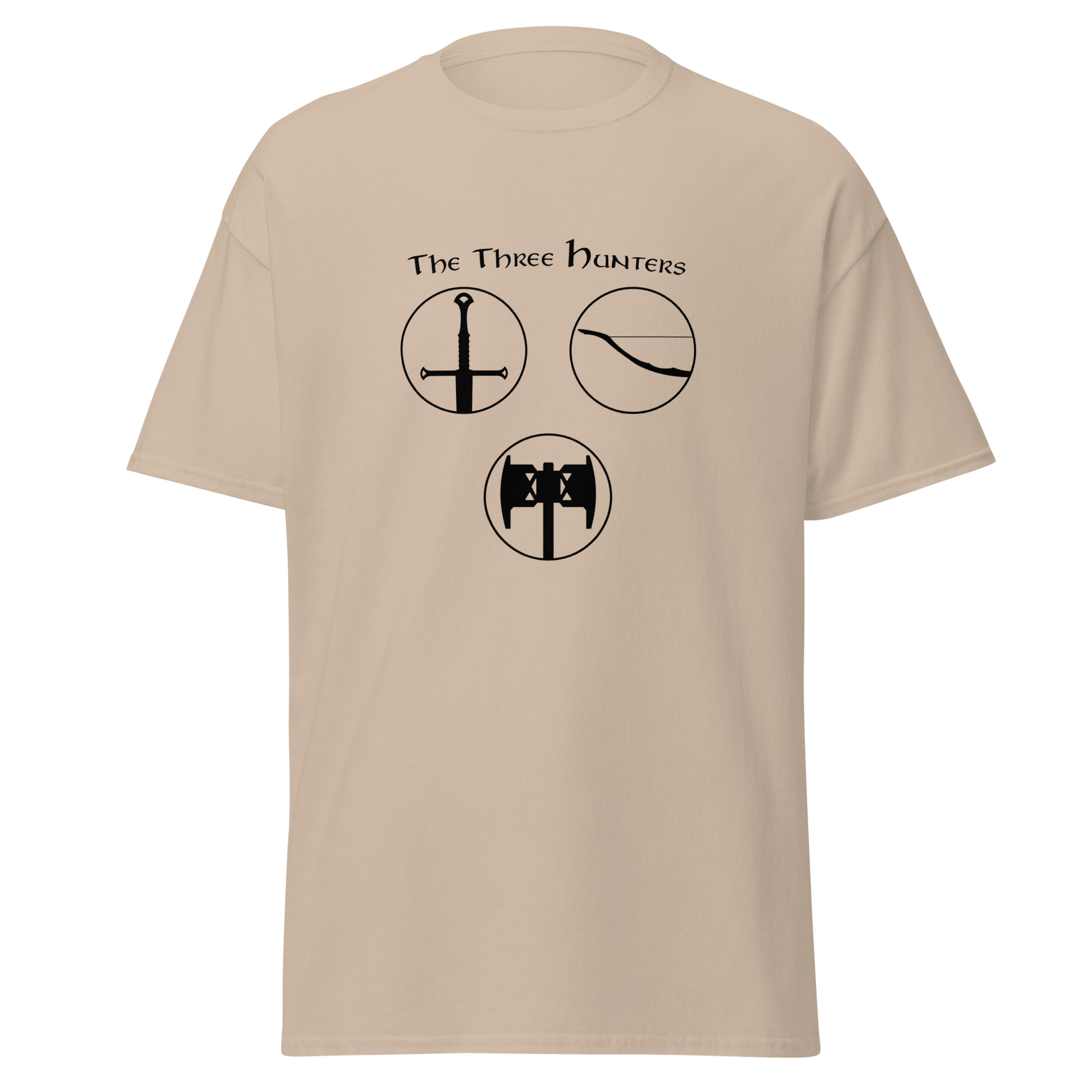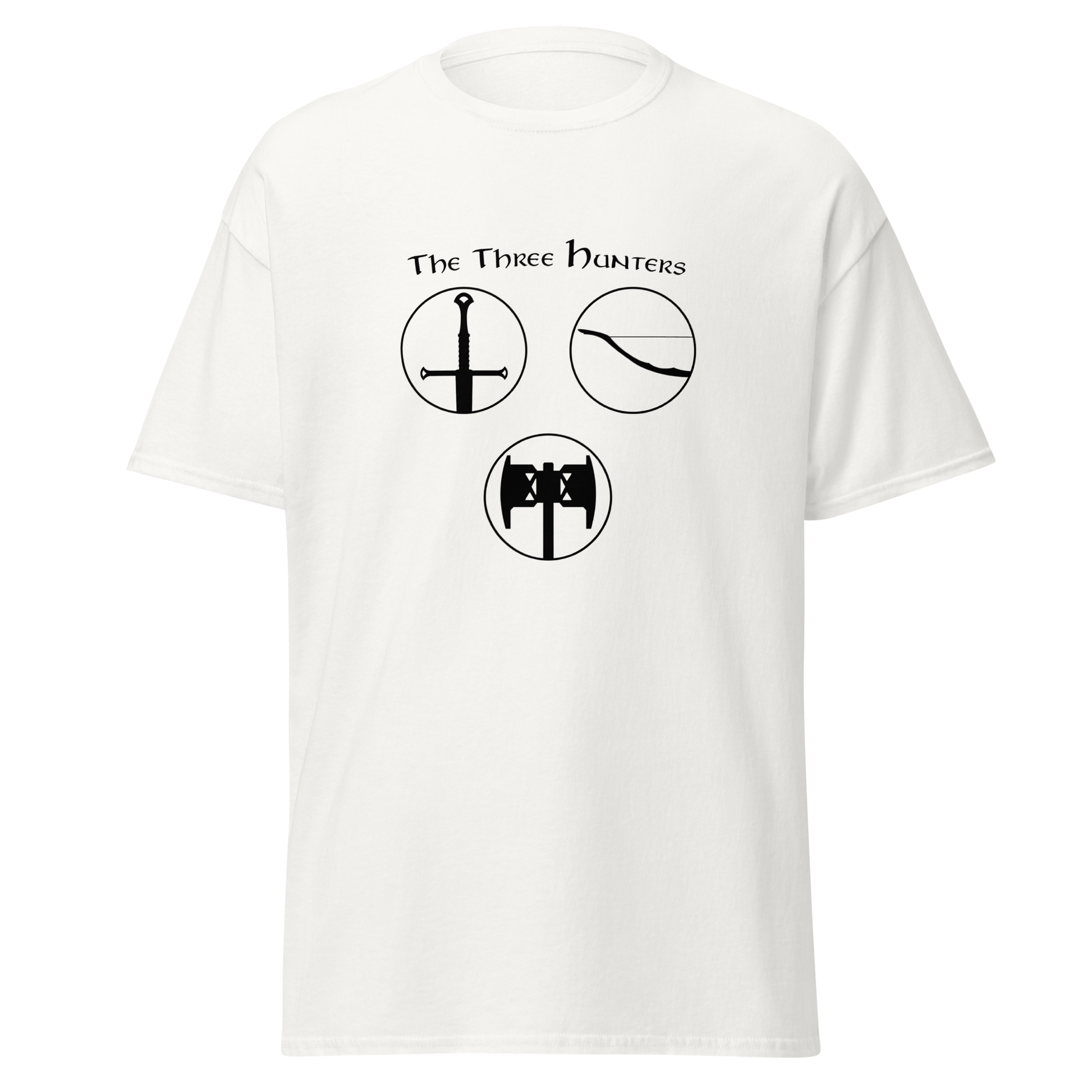 Embark on a journey of courage and camaraderie with our "The Three Hunters T-shirt." Featuring the legendary trio of Aragorn, Legolas, and Gimli in a striking circular design, this shirt is a tribute to the enduring spirit of the Fellowship. Feel the valor and strength of these iconic characters as you step into the world of Middle-earth, wearing a T-shirt that echoes the timeless bond forged in the fires of adversity.