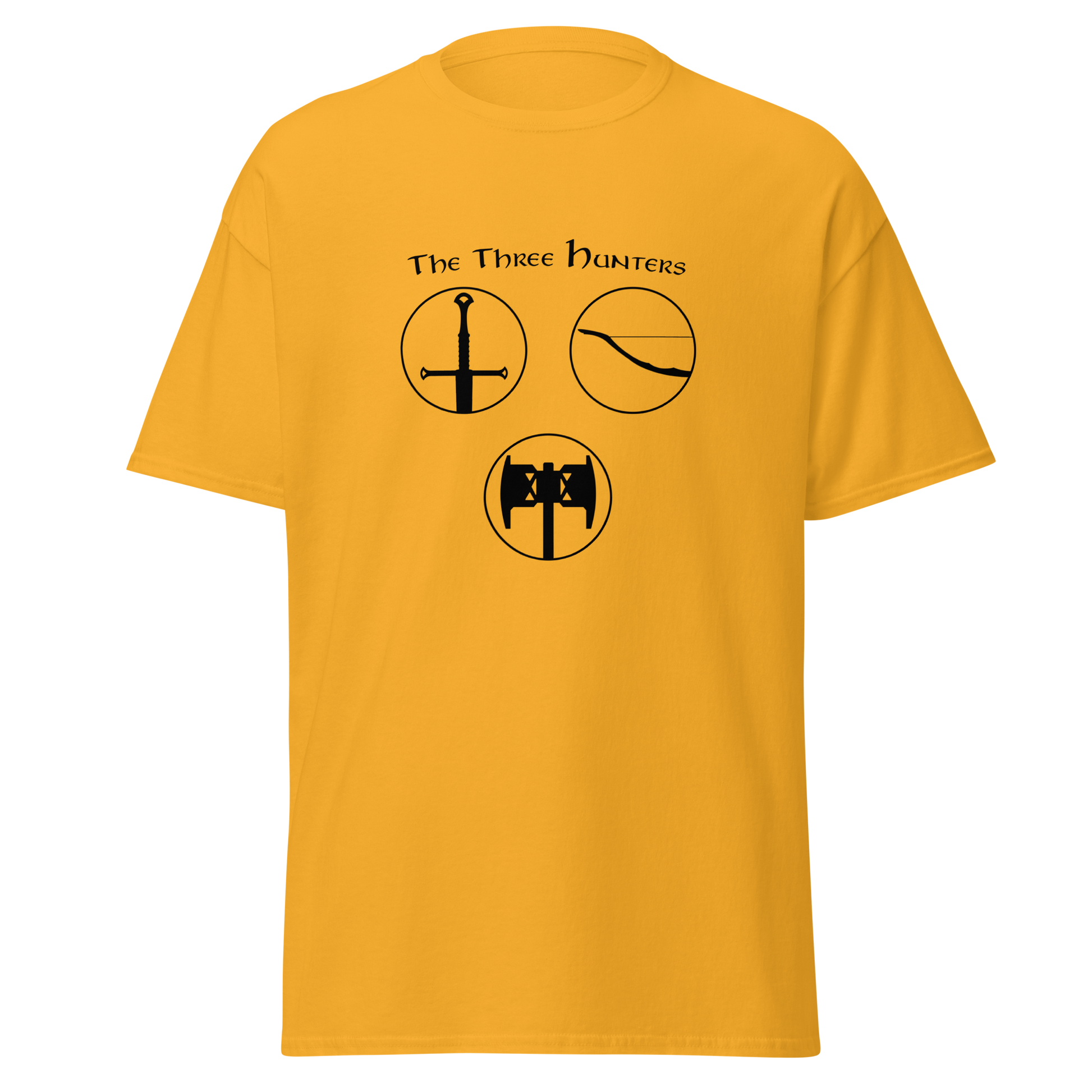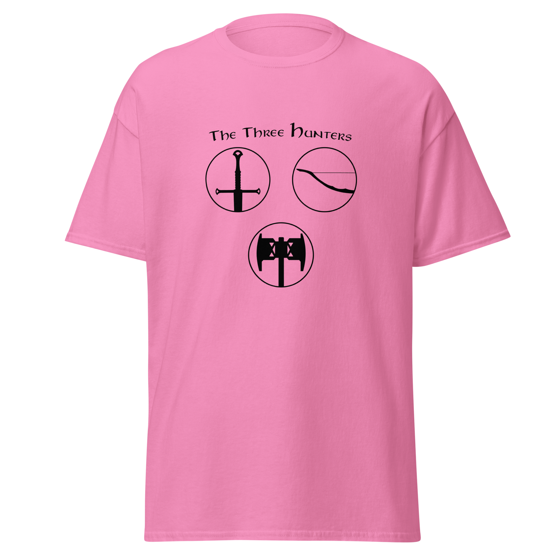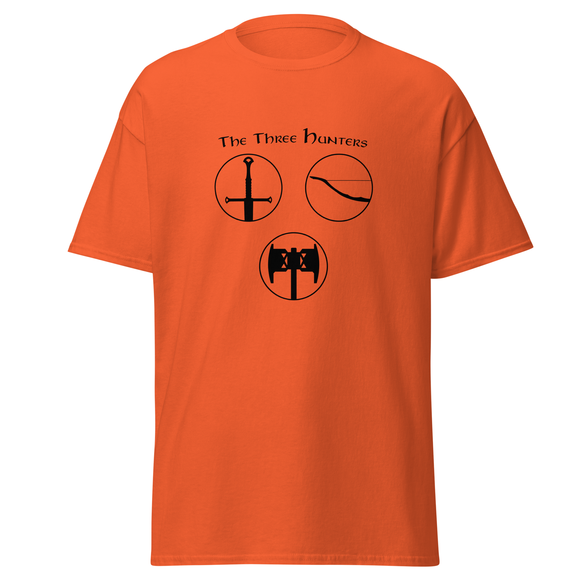 Embark on a journey of courage and camaraderie with our "The Three Hunters T-shirt." Featuring the legendary trio of Aragorn, Legolas, and Gimli in a striking circular design, this shirt is a tribute to the enduring spirit of the Fellowship. Feel the valor and strength of these iconic characters as you step into the world of Middle-earth, wearing a T-shirt that echoes the timeless bond forged in the fires of adversity.