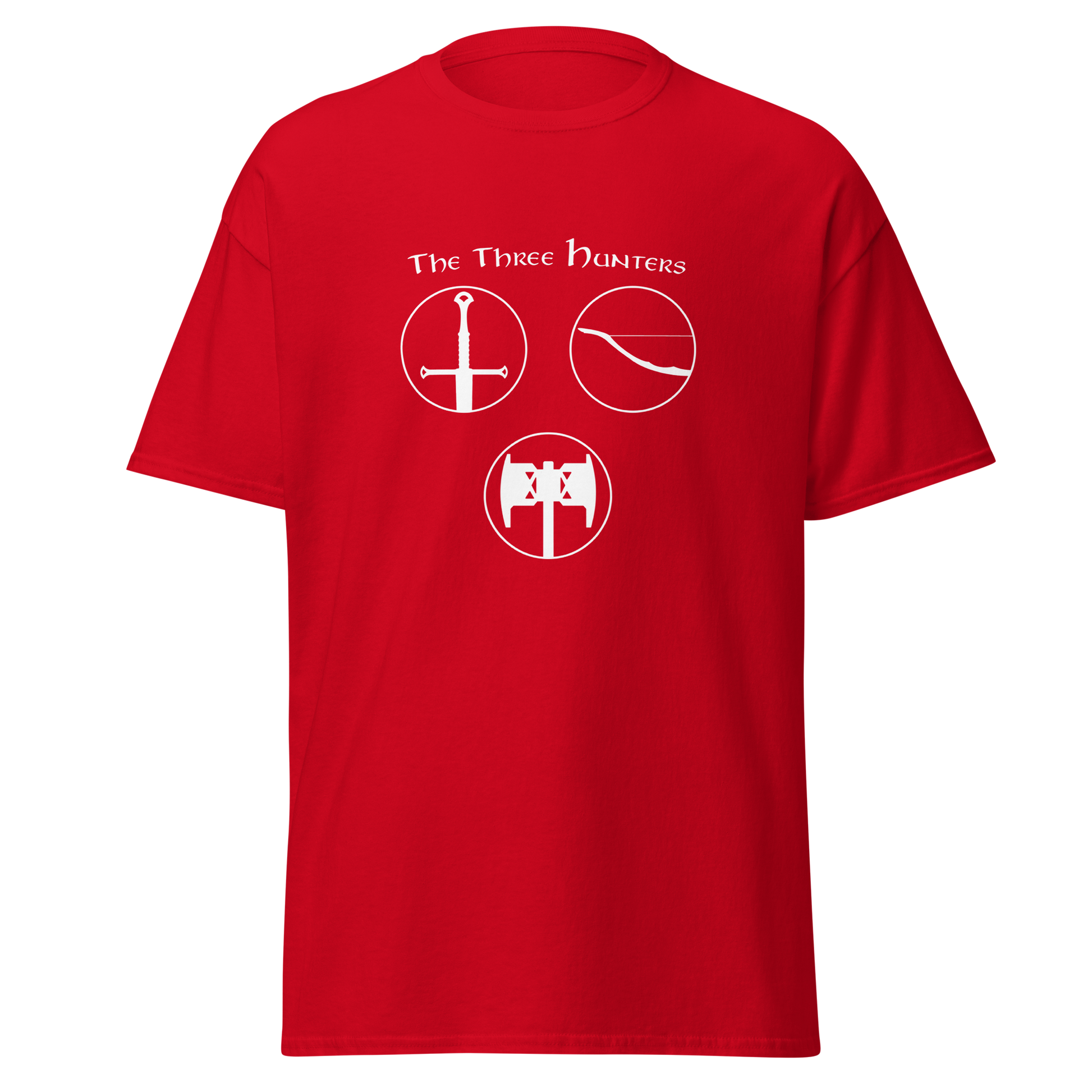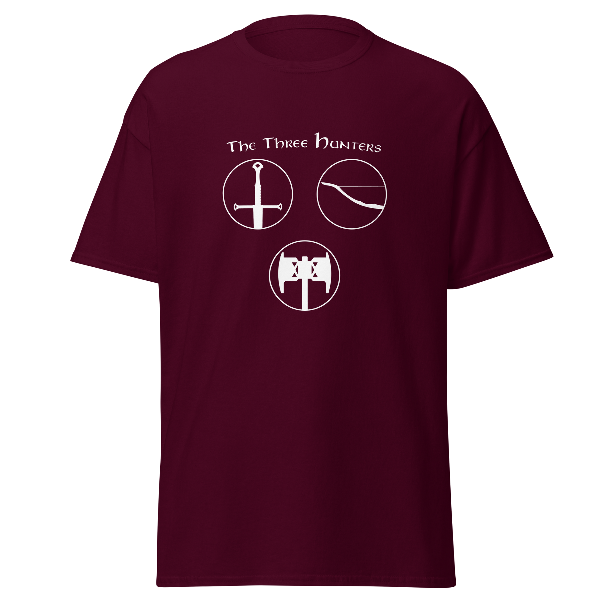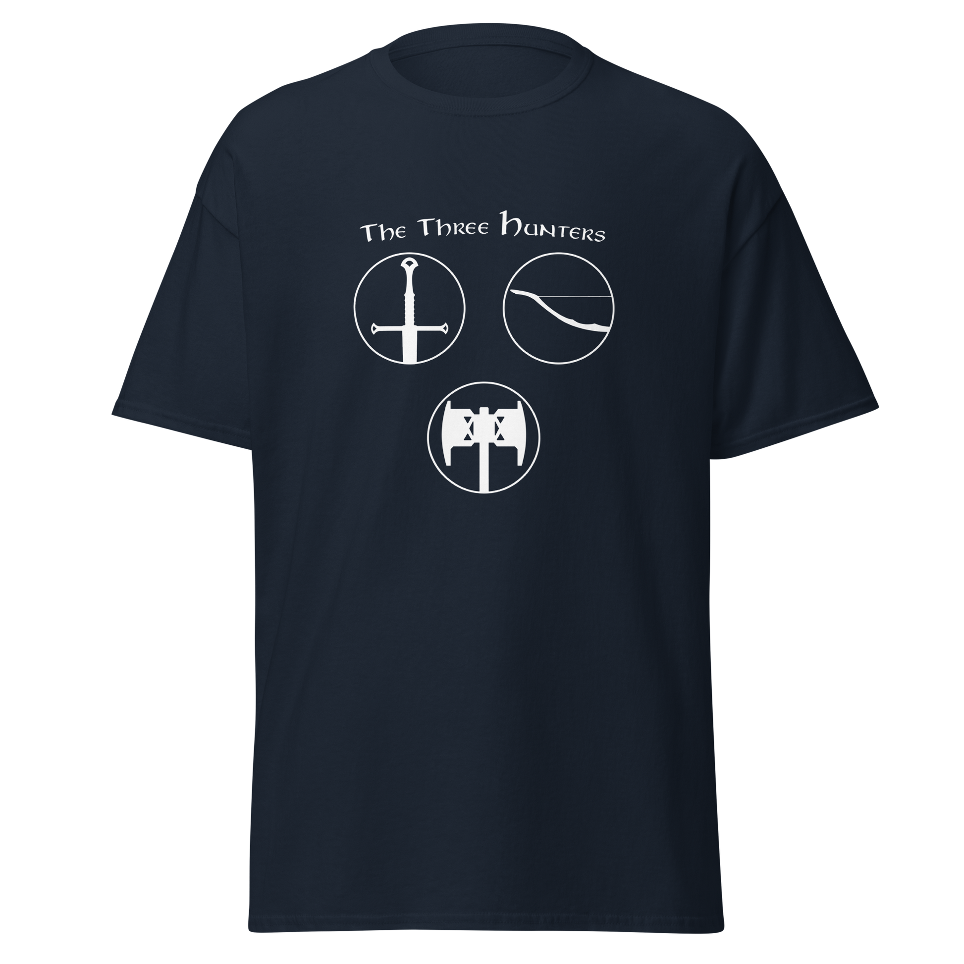 Embark on a journey of courage and camaraderie with our "The Three Hunters T-shirt." Featuring the legendary trio of Aragorn, Legolas, and Gimli in a striking circular design, this shirt is a tribute to the enduring spirit of the Fellowship. Feel the valor and strength of these iconic characters as you step into the world of Middle-earth, wearing a T-shirt that echoes the timeless bond forged in the fires of adversity.