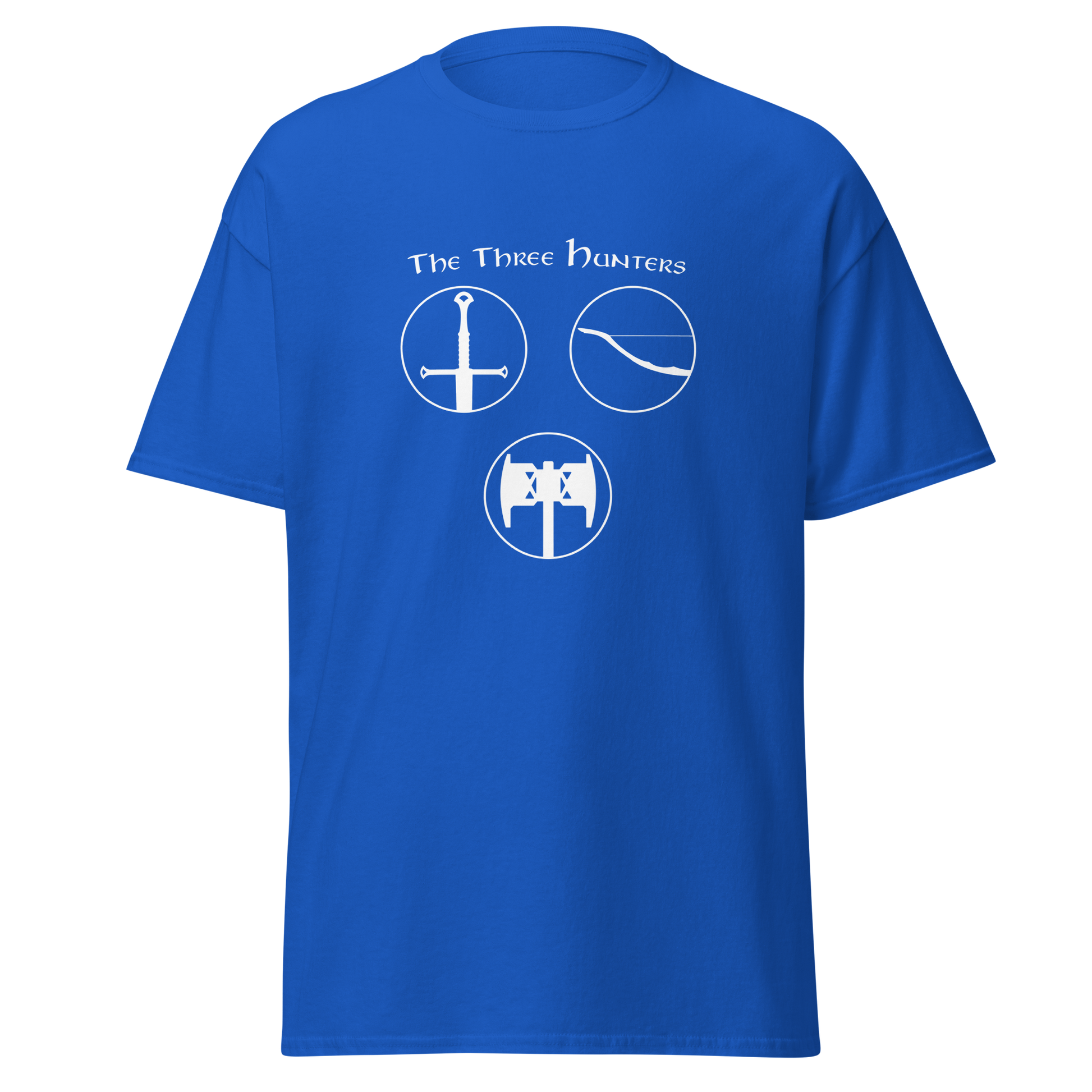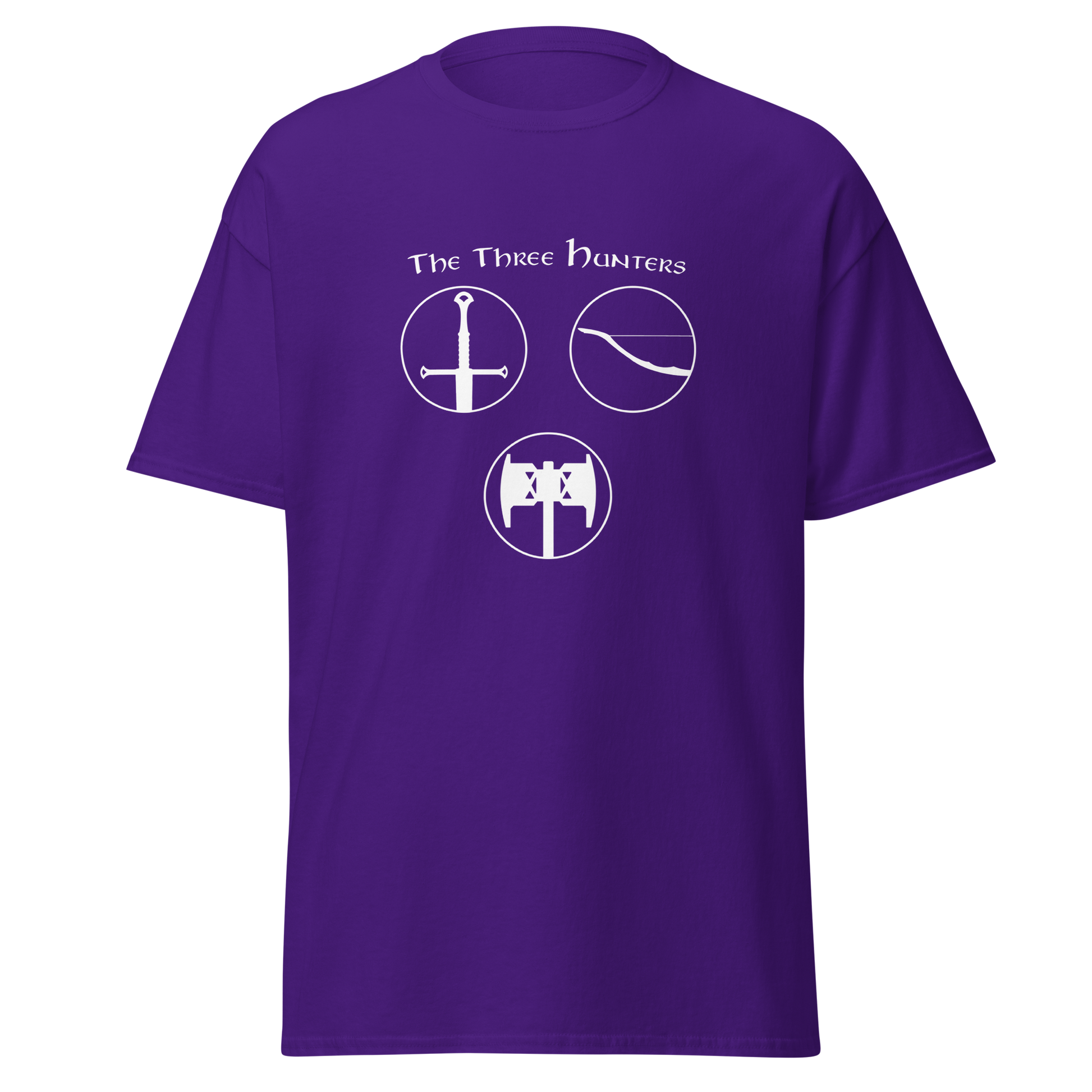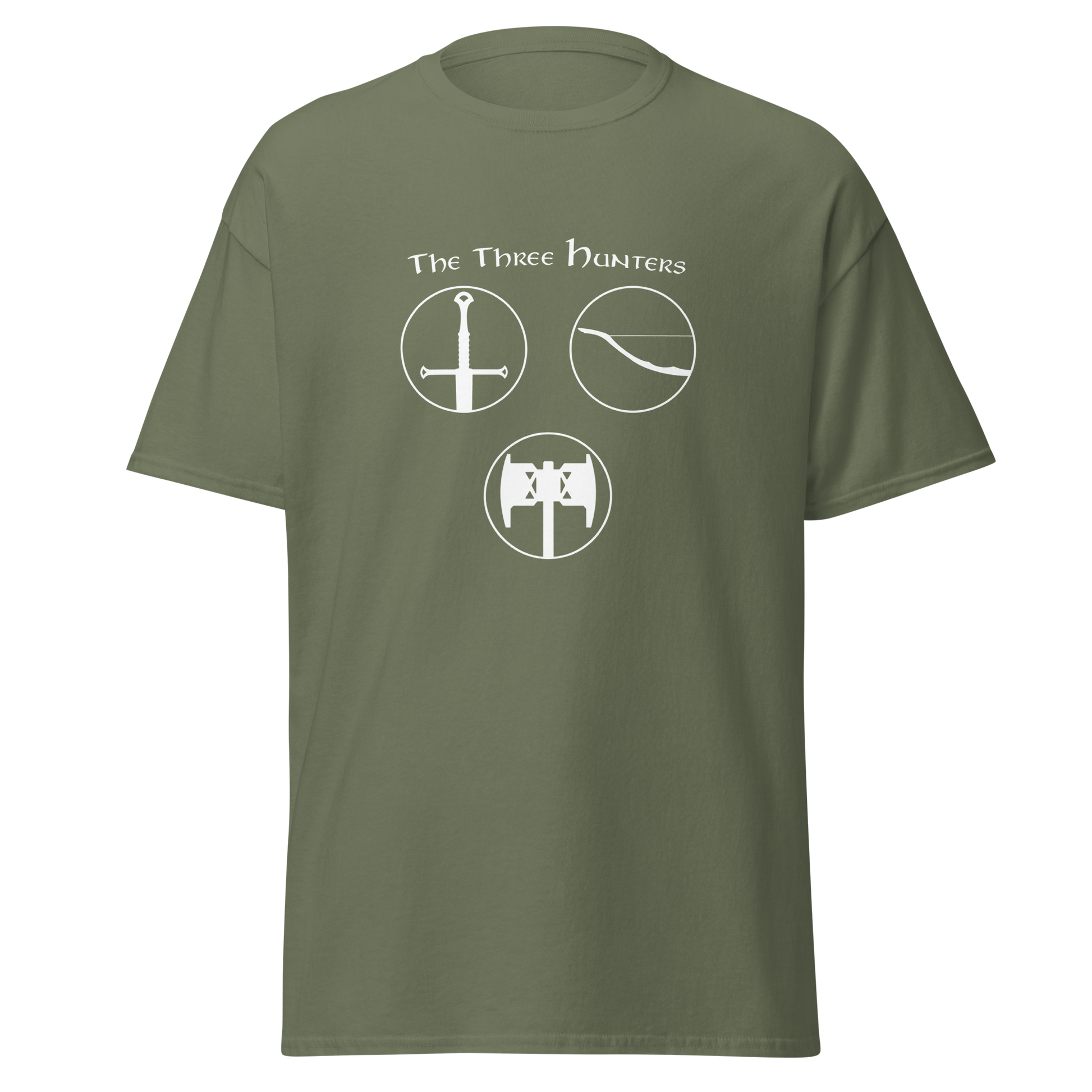 Embark on a journey of courage and camaraderie with our "The Three Hunters T-shirt." Featuring the legendary trio of Aragorn, Legolas, and Gimli in a striking circular design, this shirt is a tribute to the enduring spirit of the Fellowship. Feel the valor and strength of these iconic characters as you step into the world of Middle-earth, wearing a T-shirt that echoes the timeless bond forged in the fires of adversity.